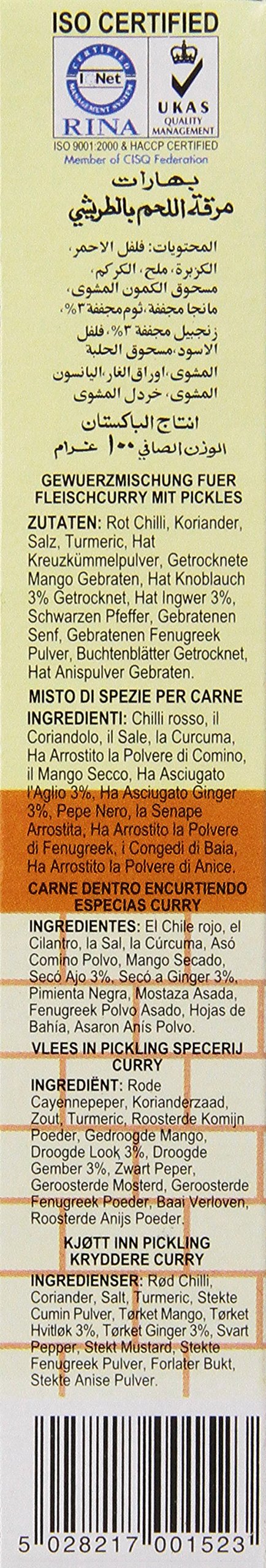 Q: How much masala is included in the pack?A: The product comes in a pack of six 100-gram boxes, totaling 600 grams of Achar Gosht Masala, providing ample seasoning for multiple dishes.