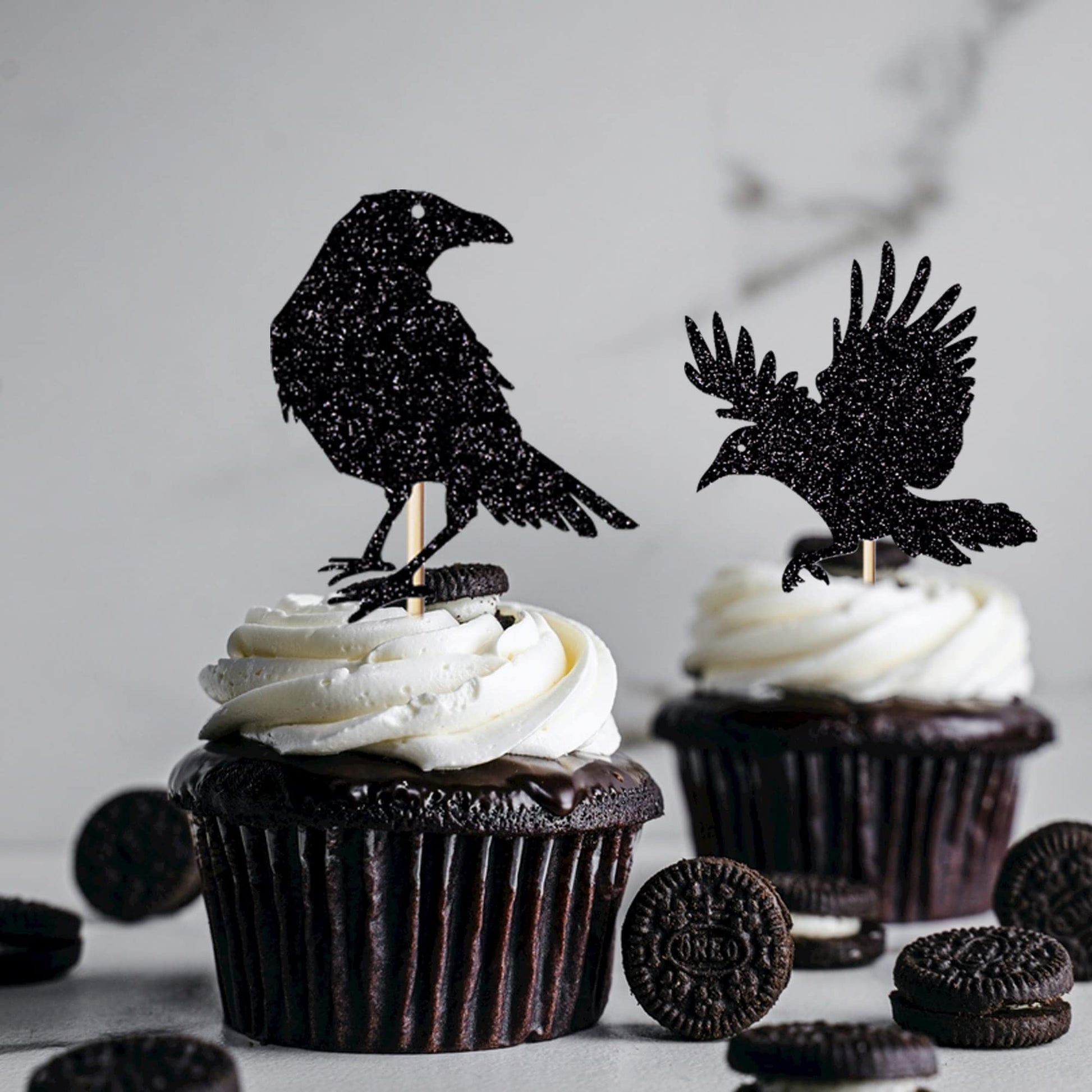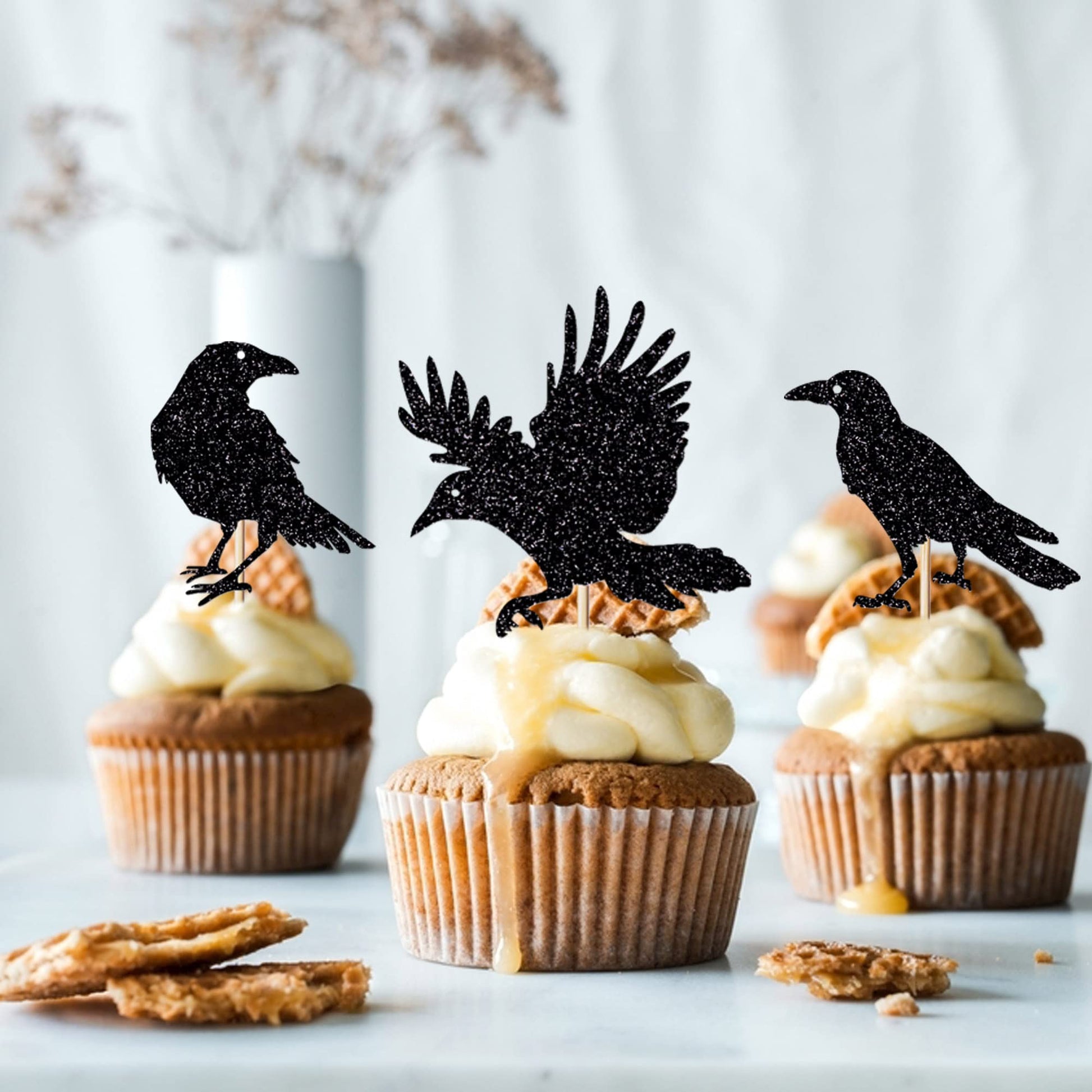 24Pcs Black Glitter Crow Dessert Cupcake Toppers - Featured Halloween Themed Party Cake Topper
