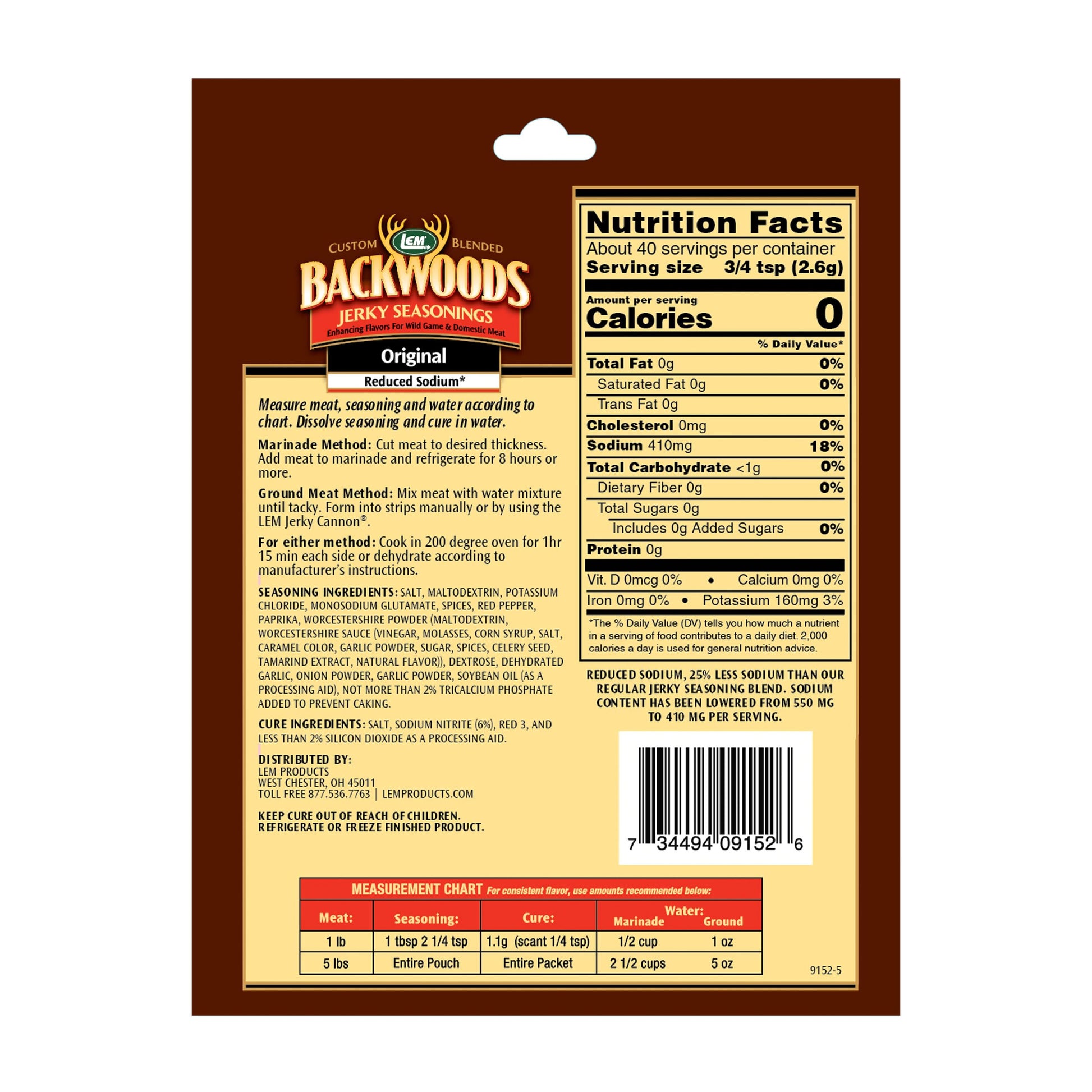 - Q: Does this seasoning contain any allergens? A: Yes, LEM Products Backwoods Reduced Sodium Jerky Seasoning contains monosodium glutamate (MSG). Always check the packaging for the most accurate allergen information.
