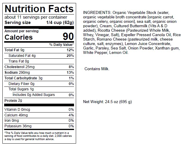 Q: What are the main ingredients in Lemon Herb Ricotta Pasta Sauce?A: Our Lemon Herb Ricotta Pasta Sauce is made with fresh ingredients, including real cream, ricotta cheese, lemon, and a blend of aromatic herbs. This ensures a rich and creamy flavor profile that elevates any dish.