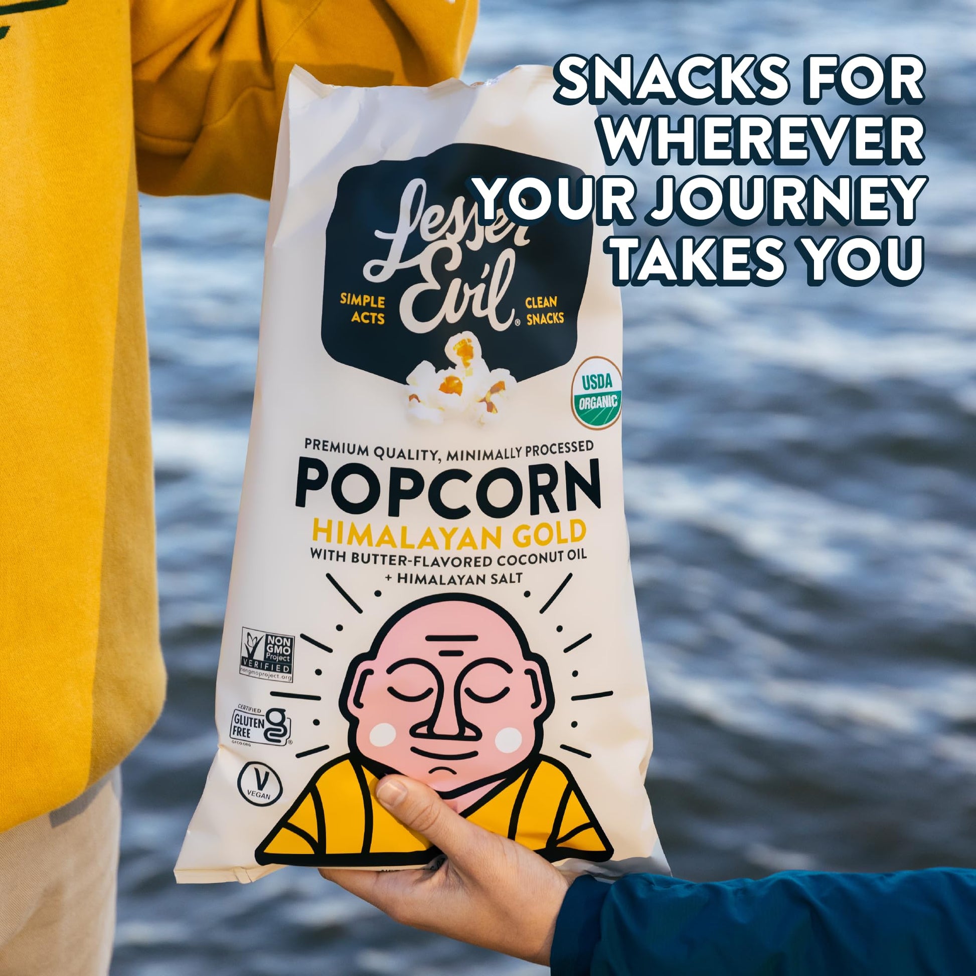 - Q: What are the ingredients in LesserEvil Himalayan Gold Organic Popcorn? A: The popcorn is made from organic popcorn, a blend of organic coconut oil, plant-based butter flavor, and Himalayan pink salt. This ensures a clean snacking experience without any artificial additives.