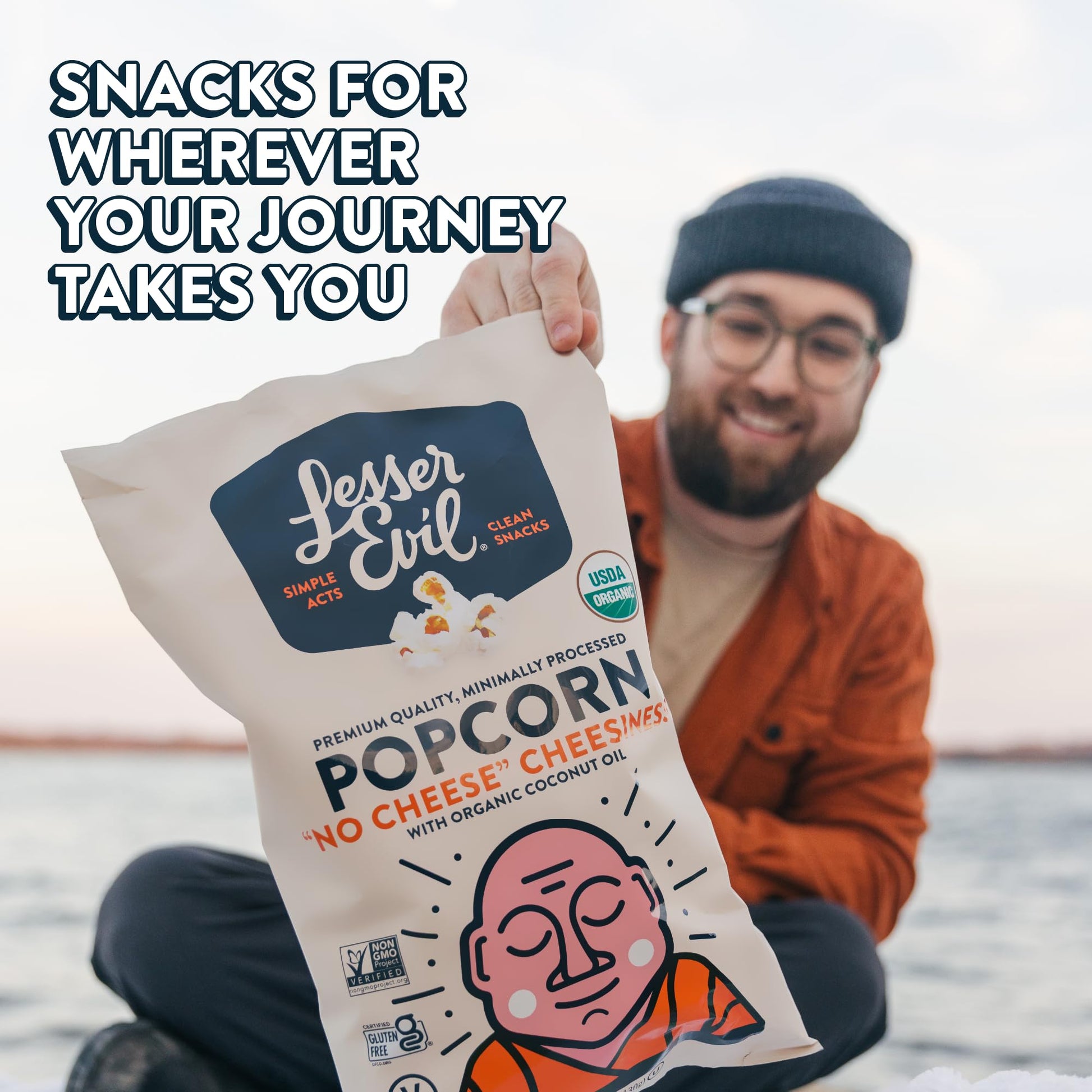 Q: How many servings are in each bag of LesserEvil No Cheese Cheesiness Organic Popcorn?A: Each 4.6 oz bag contains about 5 servings, with each serving consisting of approximately 3 cups of popcorn, making it a satisfying snack option.