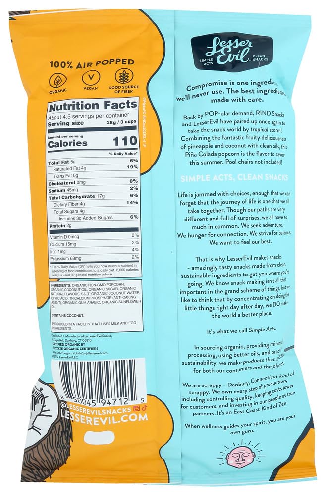 • Q: How many servings are in a bag of LESSEREVIL Organic Pina Colada Popcorn? A: A 4.6-ounce bag of LESSEREVIL Organic Pina Colada Popcorn typically contains multiple servings, making it great for sharing or enjoying over several snacking sessions.