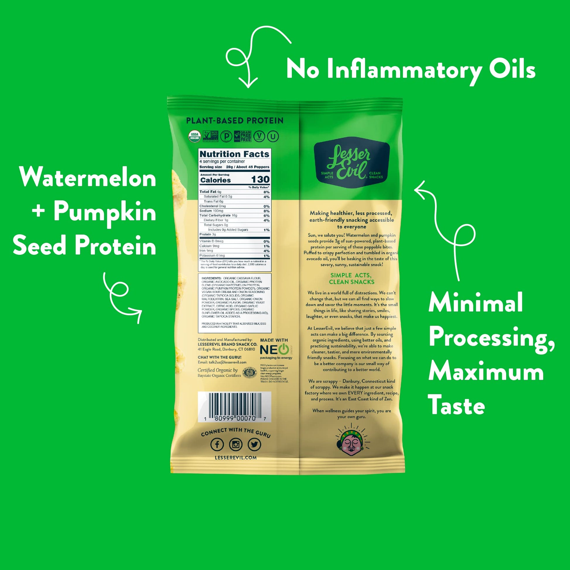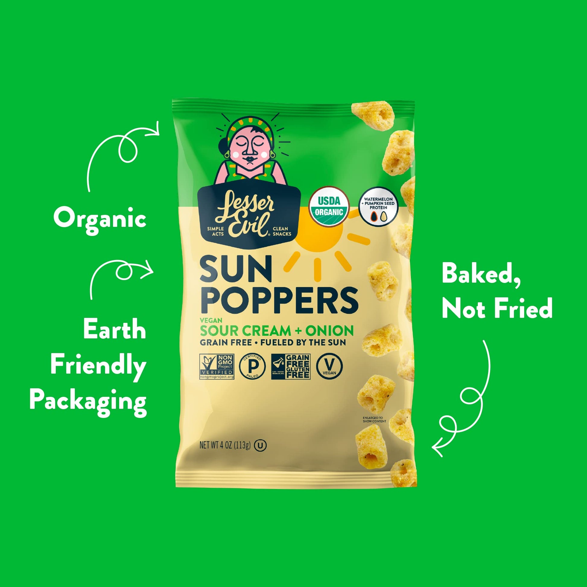 Q: What are the main ingredients in Lesserevil Sour Cream and Onion Sun Poppers?A: Lesserevil Sour Cream and Onion Sun Poppers are made without hydrogenated fats, high fructose corn syrup, bleached or bromated flour, and synthetic nitrates or nitrites, ensuring a healthier snacking option.