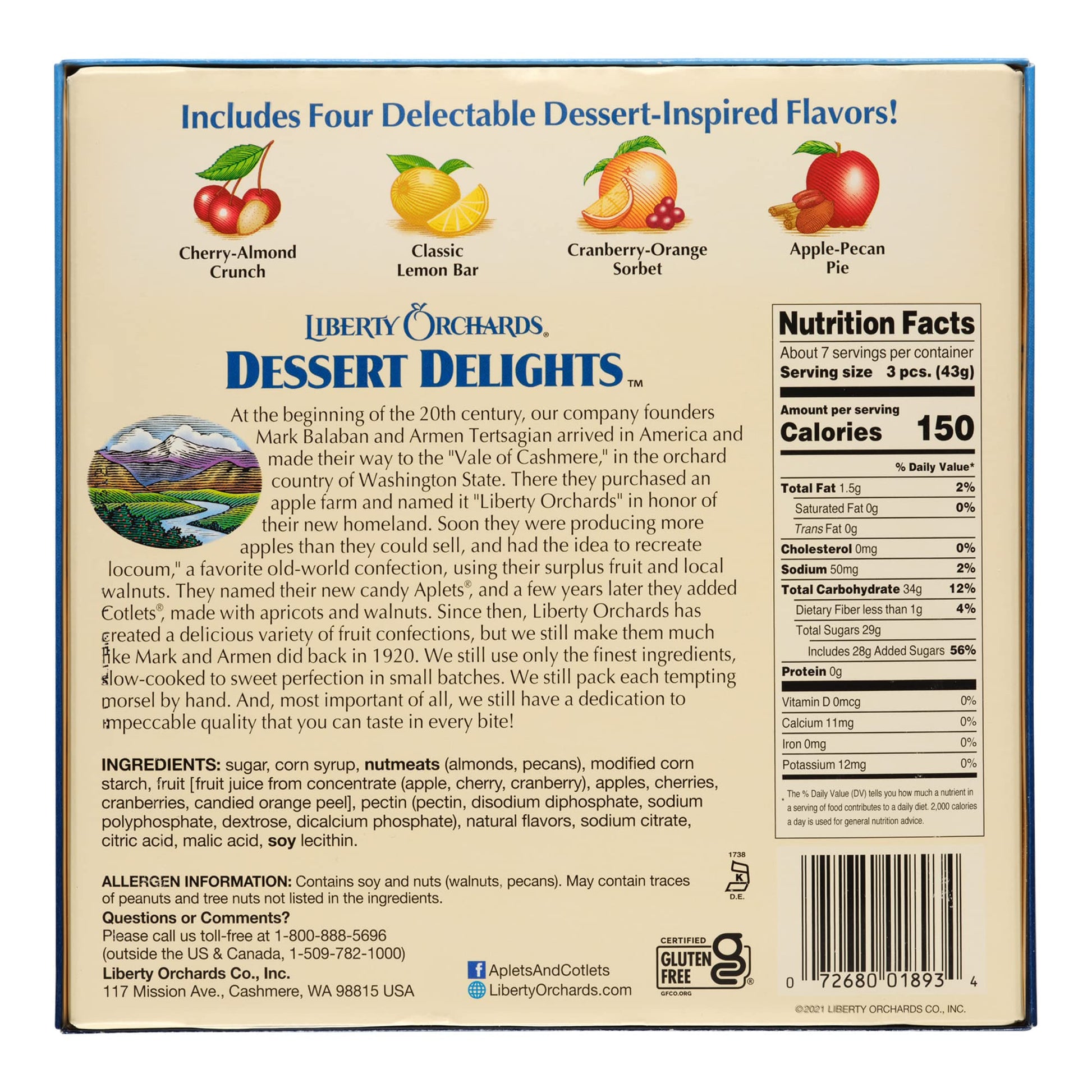 Q: What flavors are included in the Liberty Orchards Dessert Delights?A: The Liberty Orchards Dessert Delights feature a delightful assortment of four flavors: Cherry Almond Crunch, Classic Lemon, Apple Pecan Pie, and Cranberry Orange.
