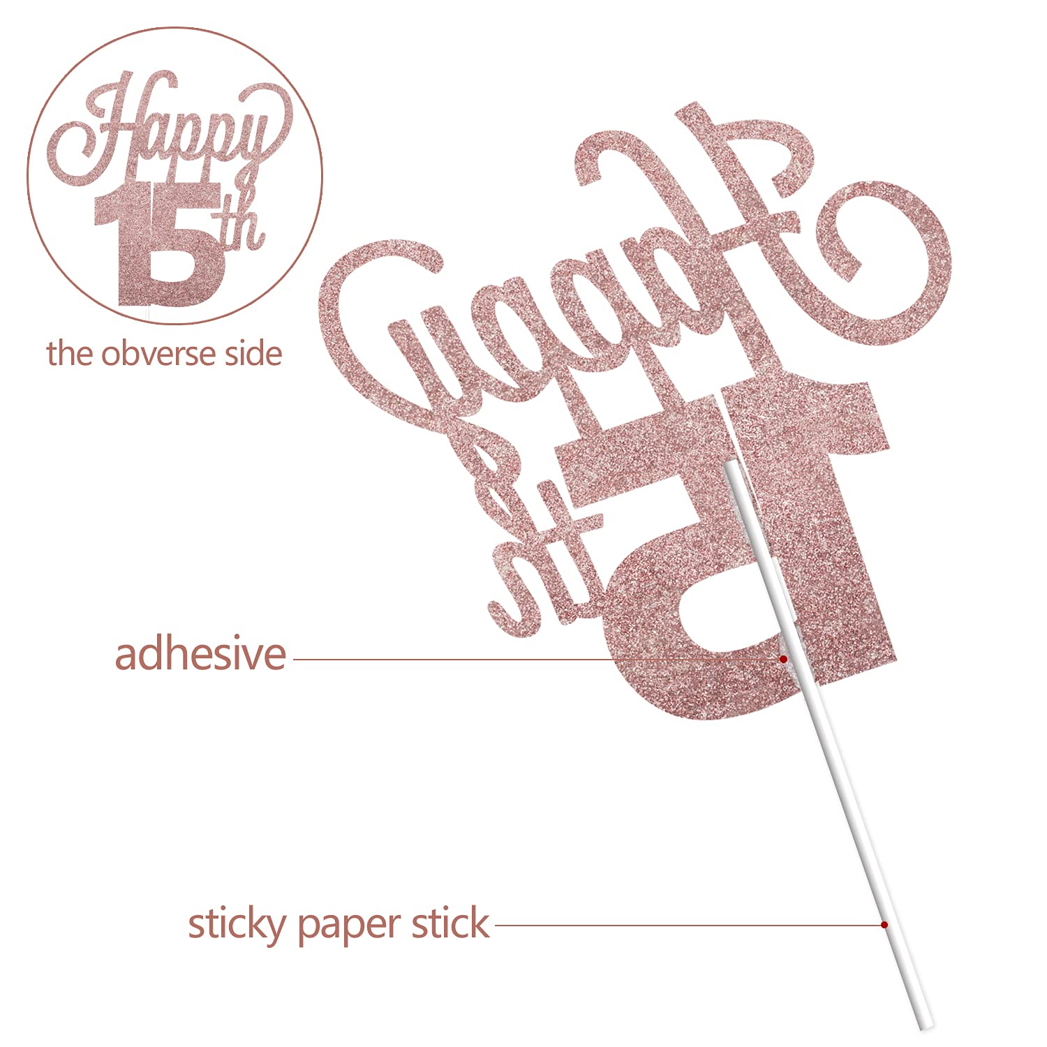 Q: What material is the cake topper made of?A: The LINGTEER Happy 15th Birthday Cake Topper is made of thick rose gold paper, which includes glitter details for added sparkle.