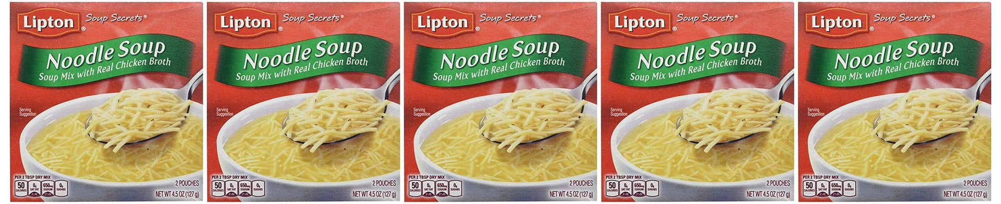 Q: What is the packaging size of Lipton Soup Secrets Noodle Soup?A: Lipton Soup Secrets Noodle Soup comes in a convenient pack of 5 cartons, each containing 4.5 ounces, perfect for stocking up or sharing with family.