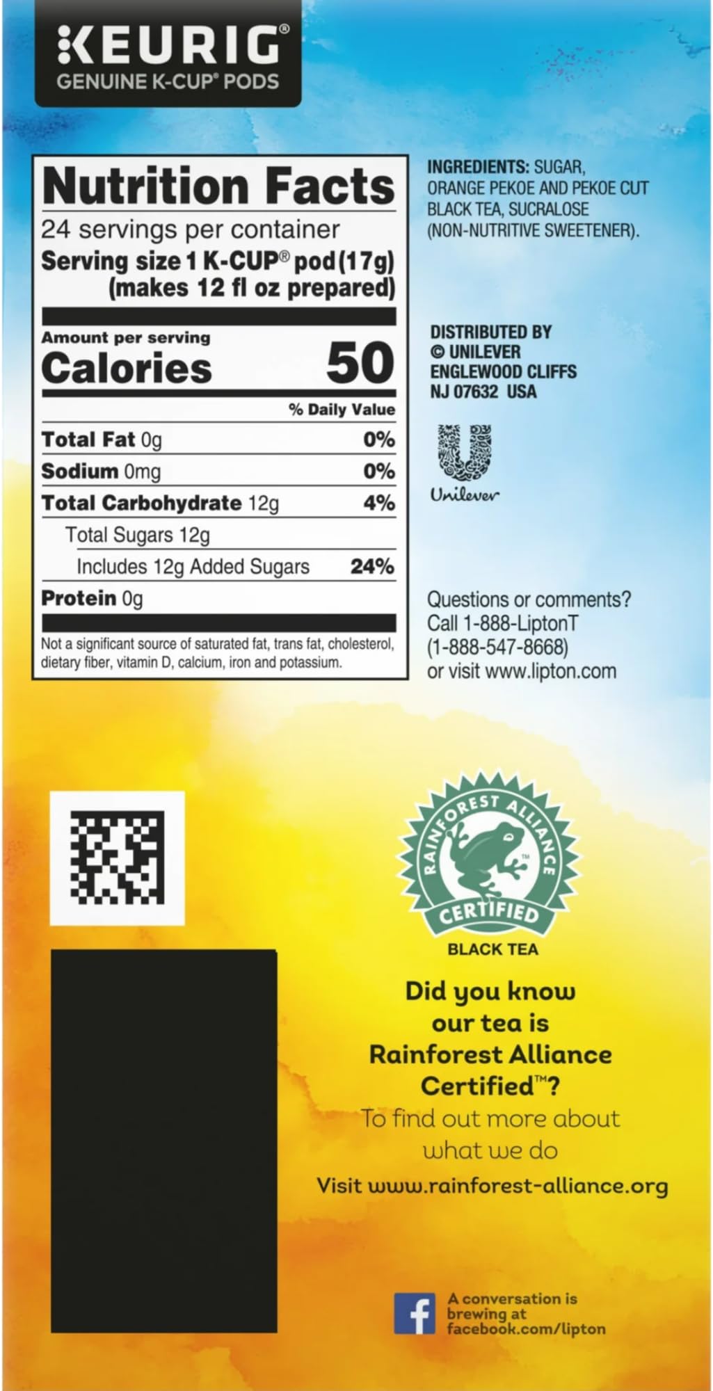 Q: Is Lipton Southern Sweet Iced Tea K-Cups certified by any organizations?A: Yes, Lipton Southern Sweet Iced Tea K-Cups are Rainforest Alliance Certified and Kosher, ensuring that they meet specific sustainability and dietary standards.