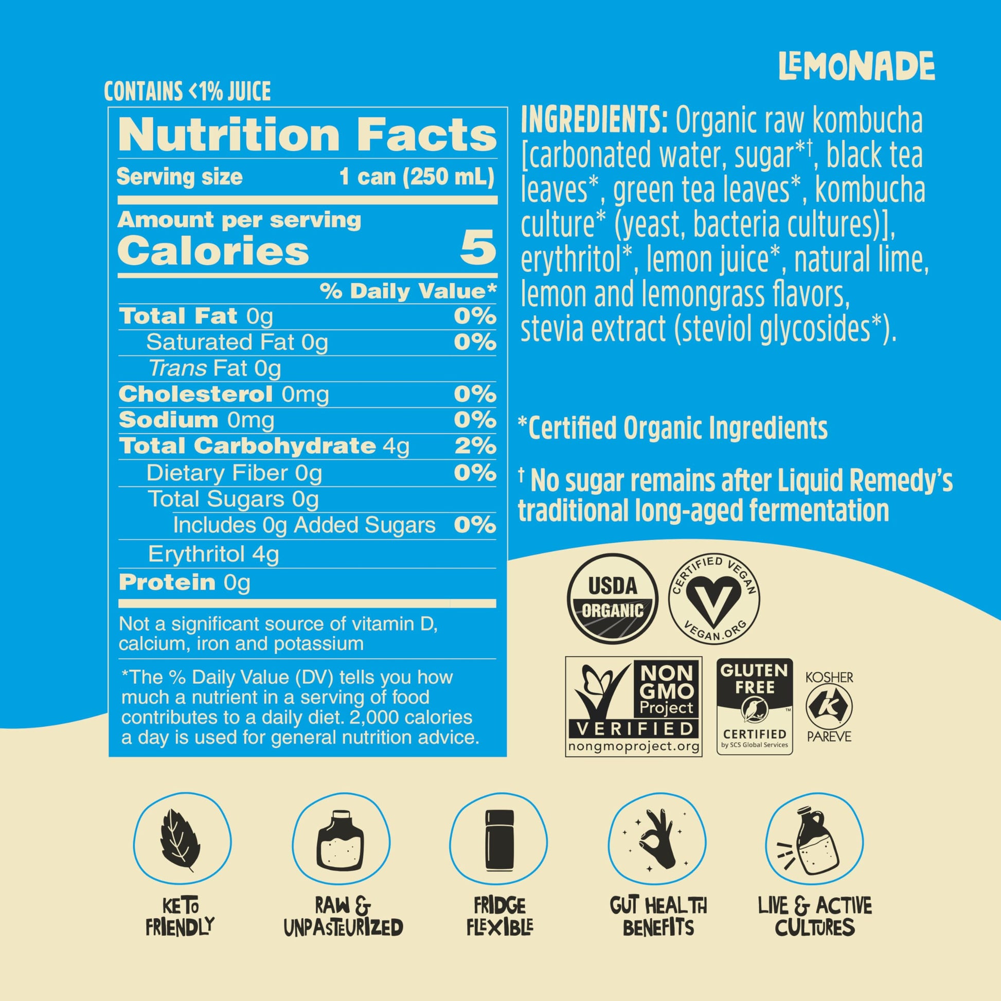 Q: What flavors are available in Liquid Remedy Kombucha?A: Liquid Remedy Kombucha offers a refreshing Lemonade flavor, combining fresh lemon juice and lime for a bold, fizzy taste that is enjoyable and invigorating.