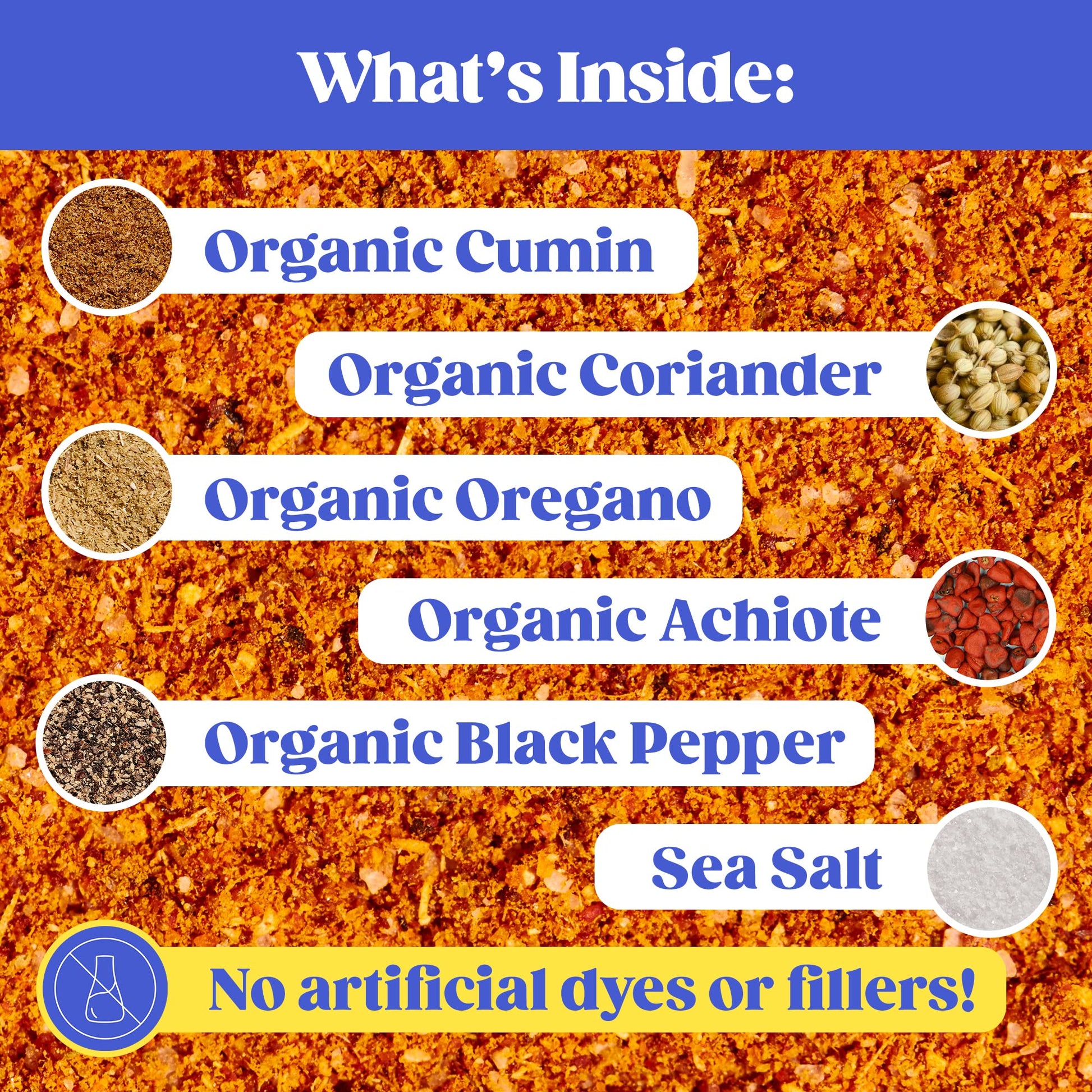 Our upgraded version of this classic Latin seasoning brings pure flavor and rich color to any dish you cook. Made con cario using the best organic spices we could find -- oregano, cumin, garlic, coriander, achiote -- with a touch of sea salt, for more honest taste. Ingredients: Sea Salt, Organic Achiote, Organic Cumin, Organic Coriander, Organic Garlic, Organic Oregano, Organic Black Pepper Nutrition Facts: Serving Size: tsp // Amount per serving: Calories: 0, Total Fat 0g (0% DV), Sodium: 110mg (5% DV), Protein: 0g, Iron: 0.2mg (0% DV), Potassium: 10mg (0% DV)