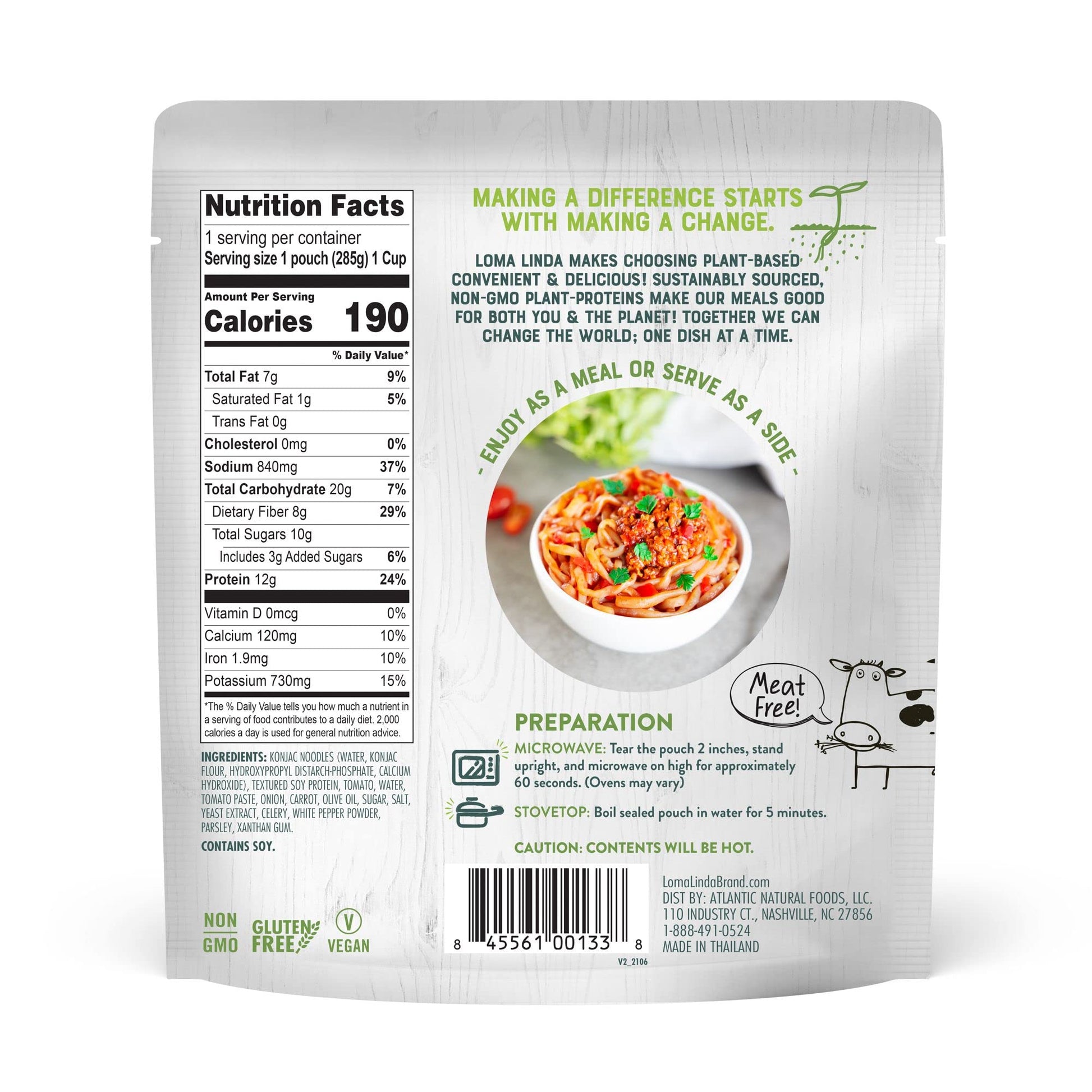 Q: What ingredients are in the Loma Linda Plant-Based Complete Meal Solution Packets?A: The Loma Linda Plant-Based Complete Meal Solution Packets include rich tomato sauce, plant-based protein, and konjac noodles, providing a hearty and satisfying meal experience.