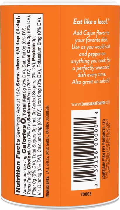 Q: What is Louisiana Fish Fry Products Cajun Seasoning used for?A: Louisiana Fish Fry Products Cajun Seasoning is a versatile spice blend that can enhance the flavor of various dishes. Use it in place of salt on meats, vegetables, soups, and seafood to add a delicious Cajun kick.