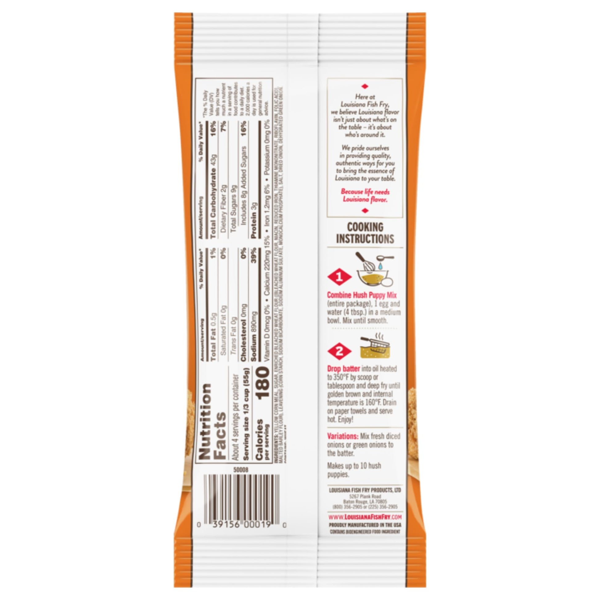 - Q: Are there any allergens in the Louisiana Fish Fry Hush Puppy Mix? A: While the specific allergen information is not provided in the product description, it is essential to check the packaging for any allergen warnings, especially for common allergens like wheat or gluten.