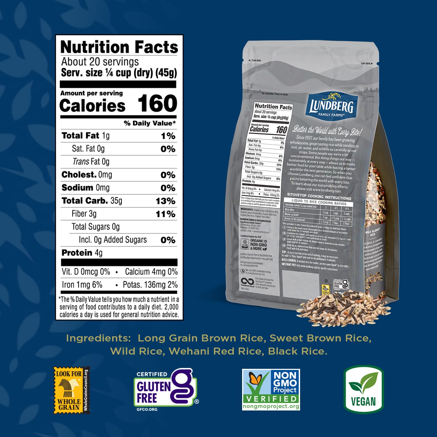 At Lundberg Family Farms, We Are Committed To Sustainable Farming Practices, While Ensuring That Our Many Rice Varieties Are Grown Without The Use Of Herbicides Or Genetically Modified Organisms (Gmos). We Believe In Delivering Products To Your Table That Are Not Only Delicious But Also Responsibly Grown.Lundberg Wild Blend Rice With Its Rich Color And Hearty Flavors Is The Most Versatile Choice For A Wide Range Of Culinary Creations, From Hearty Pilafs And Stir-Fries To Delectable Rice Salads And Comforting Side Dishes.As A Family-Owned Business, We Take Pride In Providing You With Rice That Surpasses Expectations. We Carefully Monitor Every Step Of The Process, From The Cultivation And Harvest To The Milling And Packaging, Ensuring That You Receive A Product Of Exceptional Quality And Taste Every Time.