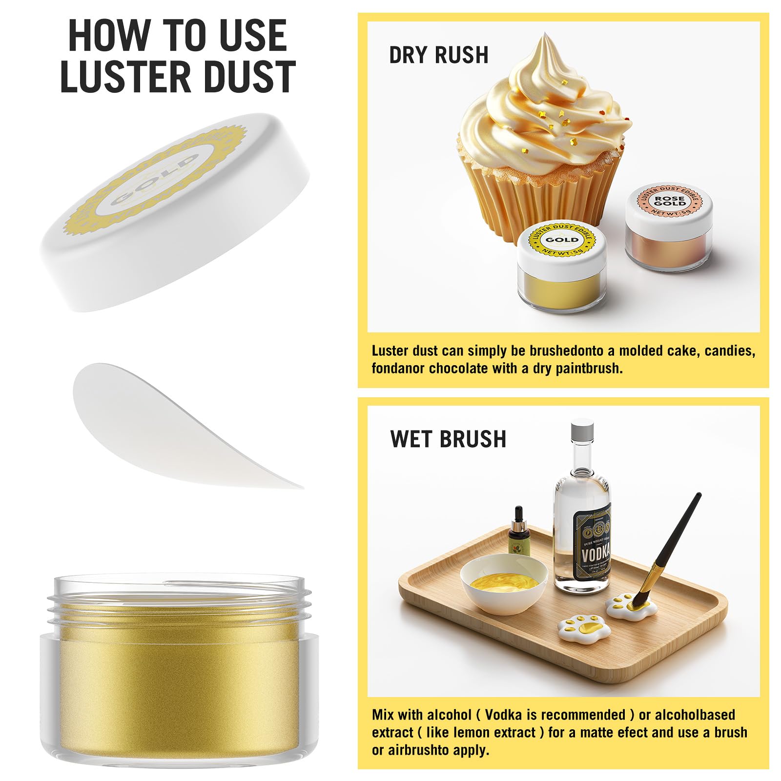 - Q: How do I use the metallic luster dust for cake decorating? A: To use the metallic luster dust, you can either brush it directly onto your project for a shimmering effect or dilute it with alcohol (like vodka), lemon extract, or oil-based flavorings to create an edible metallic paint. Avoid mixing it with water to prevent clumping.