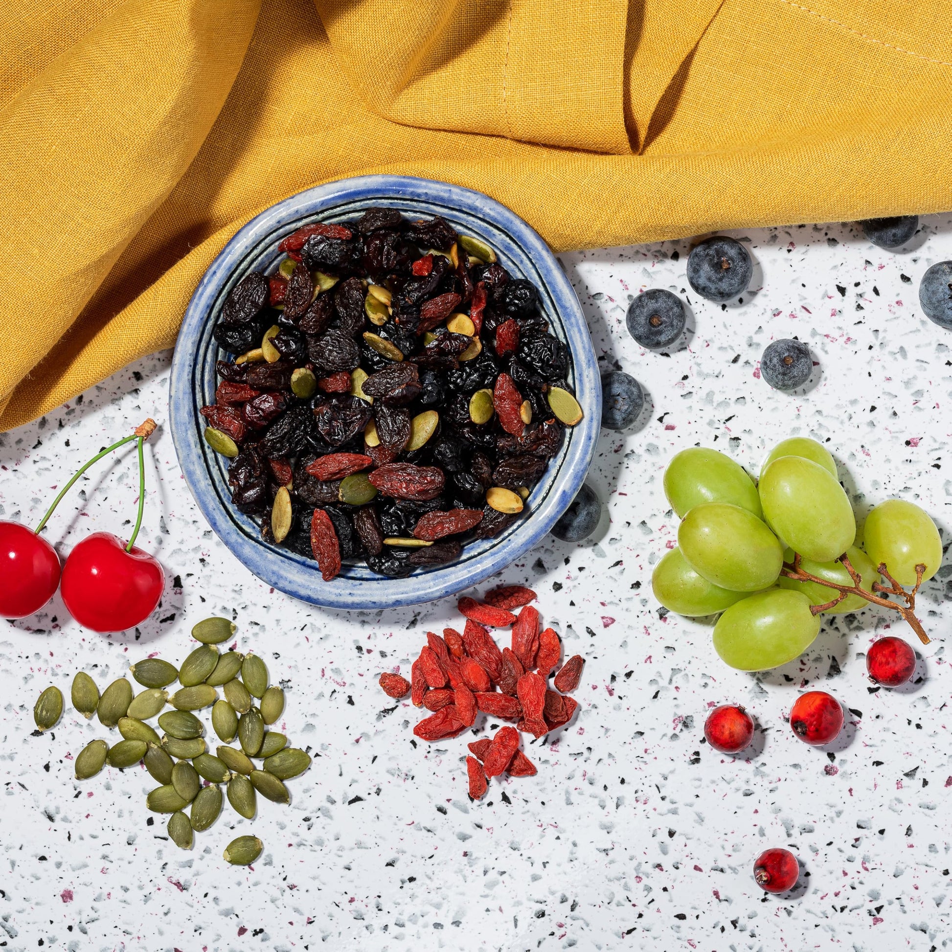 Some flavors are so astronomicalso cosmically irresistibleso out-of-this-world nutritious that its hard to believe theyre born in our galaxy. Lucky for mankind, they are. From organic cherries, blueberries and goji berries to raisins, cranberries and crunchy pepita seeds, many of the planets mightiest fruits and flavors collide in our powerhouse SuperBerry Fruit Fusion. You want sweet? POW! Its yours. You want tart? WHAM! Done. You want a snack made just the way nature intended? BOOM! This stellar blend is all over it.