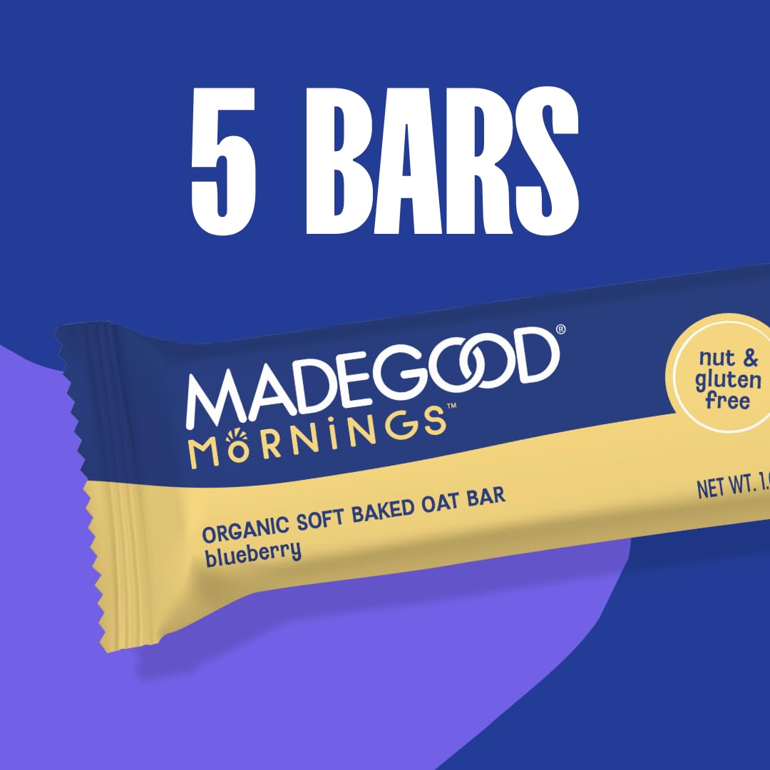 Nutritious morning bars made with wholesome ingredients: gluten-free, ethically sourced oats and blueberries. | The perfectly shareable snack, MadeGood Morning Bars are free from the top 8 allergens and made in a dedicated nut-free facility. | Contains nutrients from six different vegetable extracts. | MadeGood Morning Bars make an awesome on-the-go snack before work, school or exercise. | Enjoy 5 (1.06 oz) individually wrapped Blueberry Morning Bars that will keep you fuller, for longer.