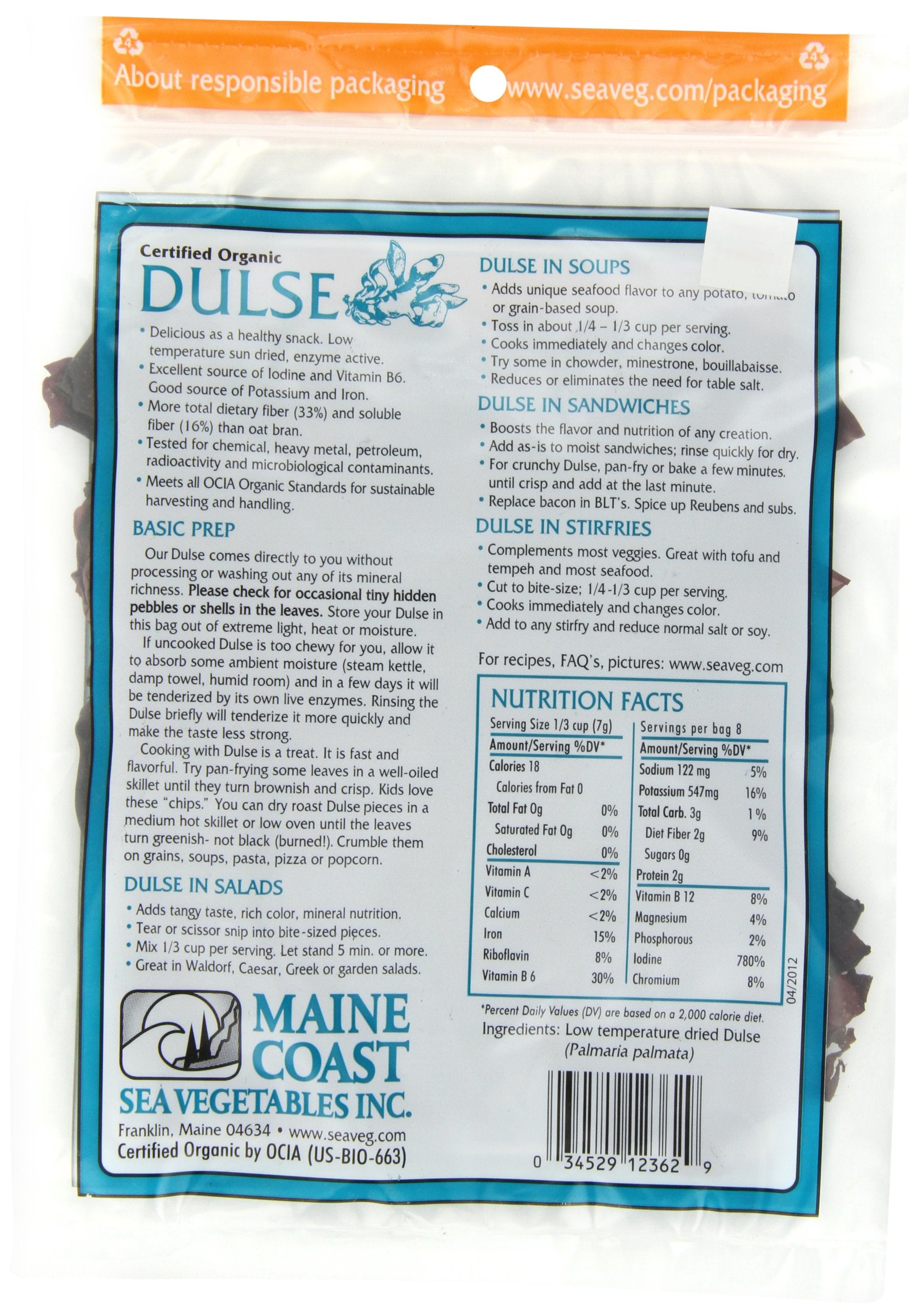 • Q: What is MAINE COAST DULSE and how can I use it? A: MAINE COAST DULSE is a type of dried seaweed that is certified organic and can be used in a variety of ways. It's great for salads, snacks, soups, and stir-fries. You can enjoy it as a healthy snack on its own or incorporate it into your favorite dishes for added flavor and nutrition.
