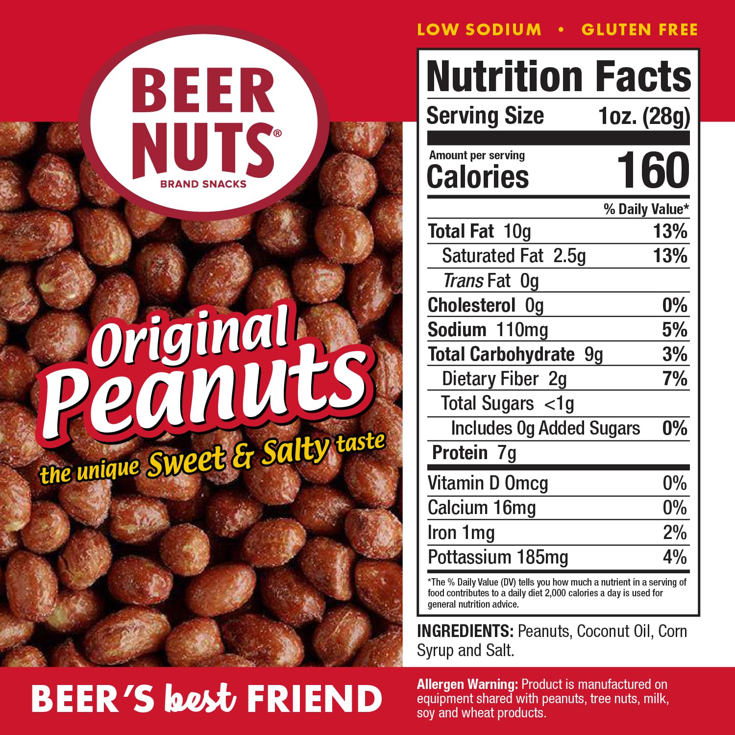 - Q: What is the serving size for BEER NUTS Original Peanuts? A: The serving size for BEER NUTS Original Peanuts is typically one ounce, which provides a satisfying snack while also delivering a good amount of protein and essential nutrients.