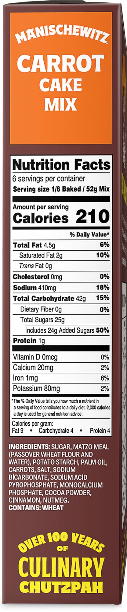 Q: What is included in the Manischewitz Carrot Cake Mix package?A: The package includes the carrot cake mix, detailed baking instructions, and a baking pan for your convenience.