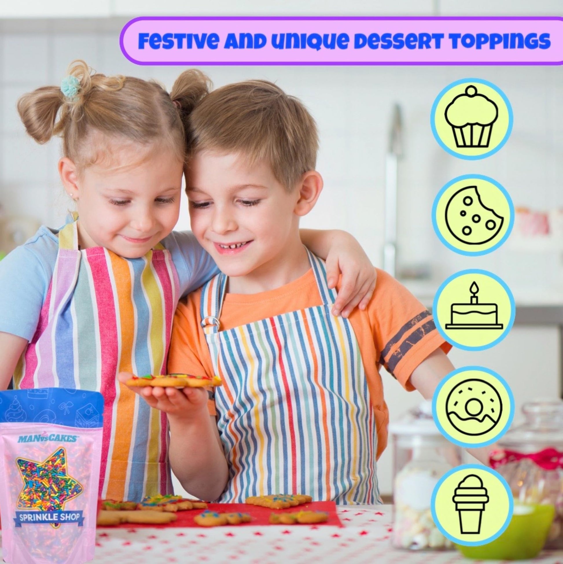 • Q: Are these sprinkles safe for children? A: While Manvscakes Sprinkles are designed to be enjoyed by all ages, they are not recommended for children under three years old due to the small parts in the sprinkle mix. Always supervise young children when enjoying any candy or sprinkles.