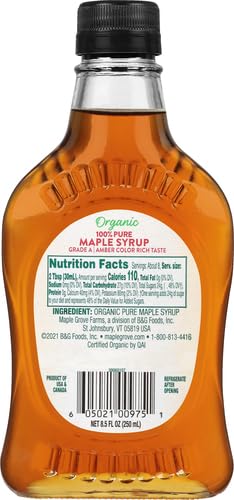 Q: What size is the Maple Grove Farms Organic Maple Syrup bottle?A: The Maple Grove Farms Organic Pure Maple Syrup comes in an 8.5 Fl Oz bottle, making it a convenient size for both home use and gifting.