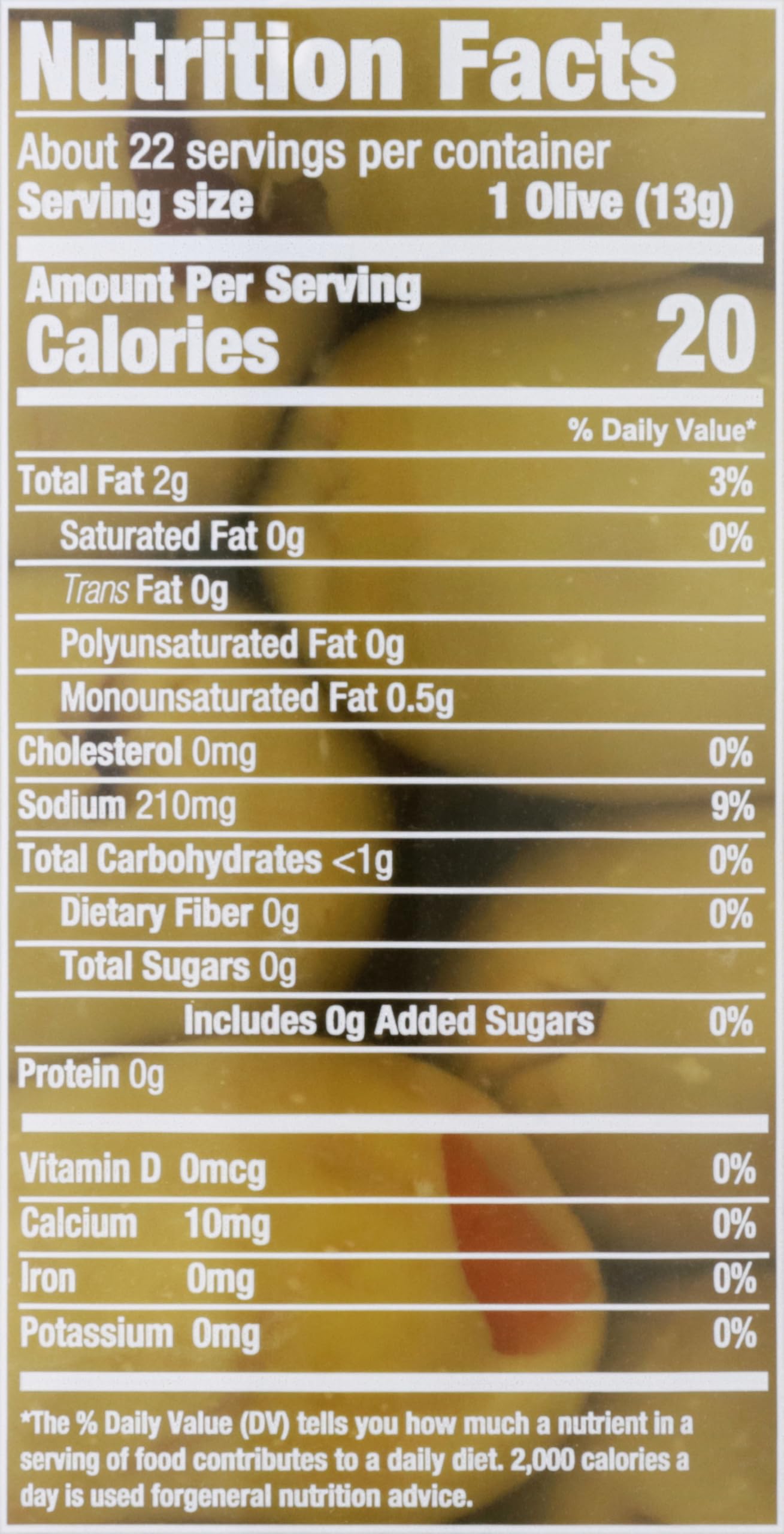 - Q: What is the weight of the jar of pimento stuffed olives? A: The jar of Mario Camacho Foods Pimento Stuffed Queen Party Olives contains 10 ounces of olives, making it an ideal size for sharing at gatherings or enjoying as a personal snack.