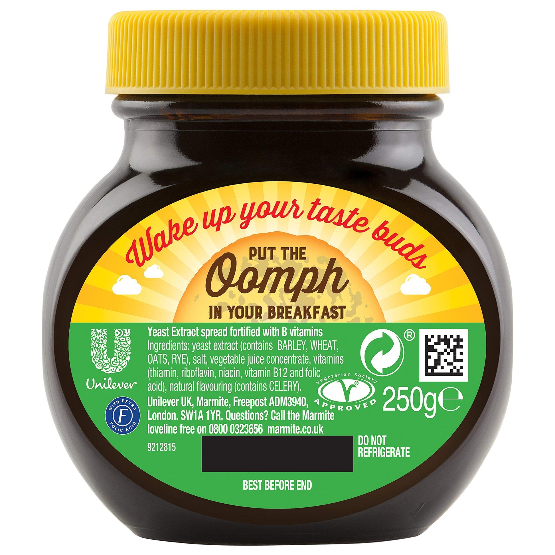 Marmite Yeast Extract Spread is a unique & delicious breakfast idea, which helps make your mornings a little better! Our yeast extract spreads easily on toast, providing a quick & simple breakfast solution for the whole family to enjoy. Whats more, Marmite is rich in B vitamins and has no added sugar - what more could you want from a breakfast?! Spread Marmite on toast, crumpets, bagels and a host of other foods. You can even try it with eggs, avocados or cheese for an extra burst of flavor. Not only is Marmite suitable for vegans, but it has also signed up to a new recycling label scheme aimed at seeing much more packaging, especially plastics, recycled instead of ending up in landfill or in the ocean. Whether you love it or hate it, why not give it a try? Marmite is the United Kingdoms favourite Yeast Extract and has been brightening up British breakfasts since 1902.