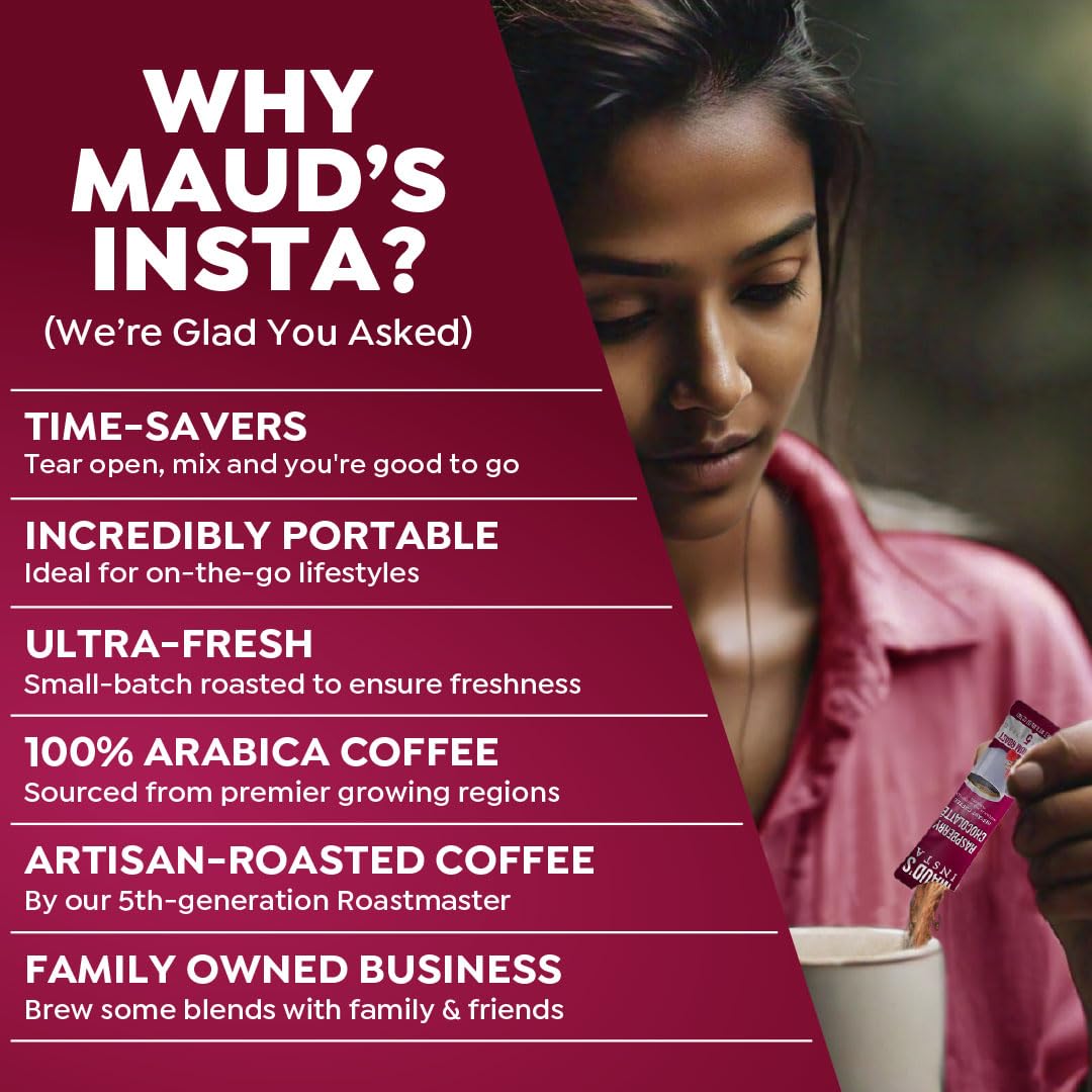 Q: Is Maud's Instant Coffee made with real coffee beans?A: Yes, Maud's Instant Raspberry Chocolate Coffee is made from 100% Arabica coffee beans, ensuring a high-quality flavor experience. The beans are carefully sourced and roasted in California for optimal taste.