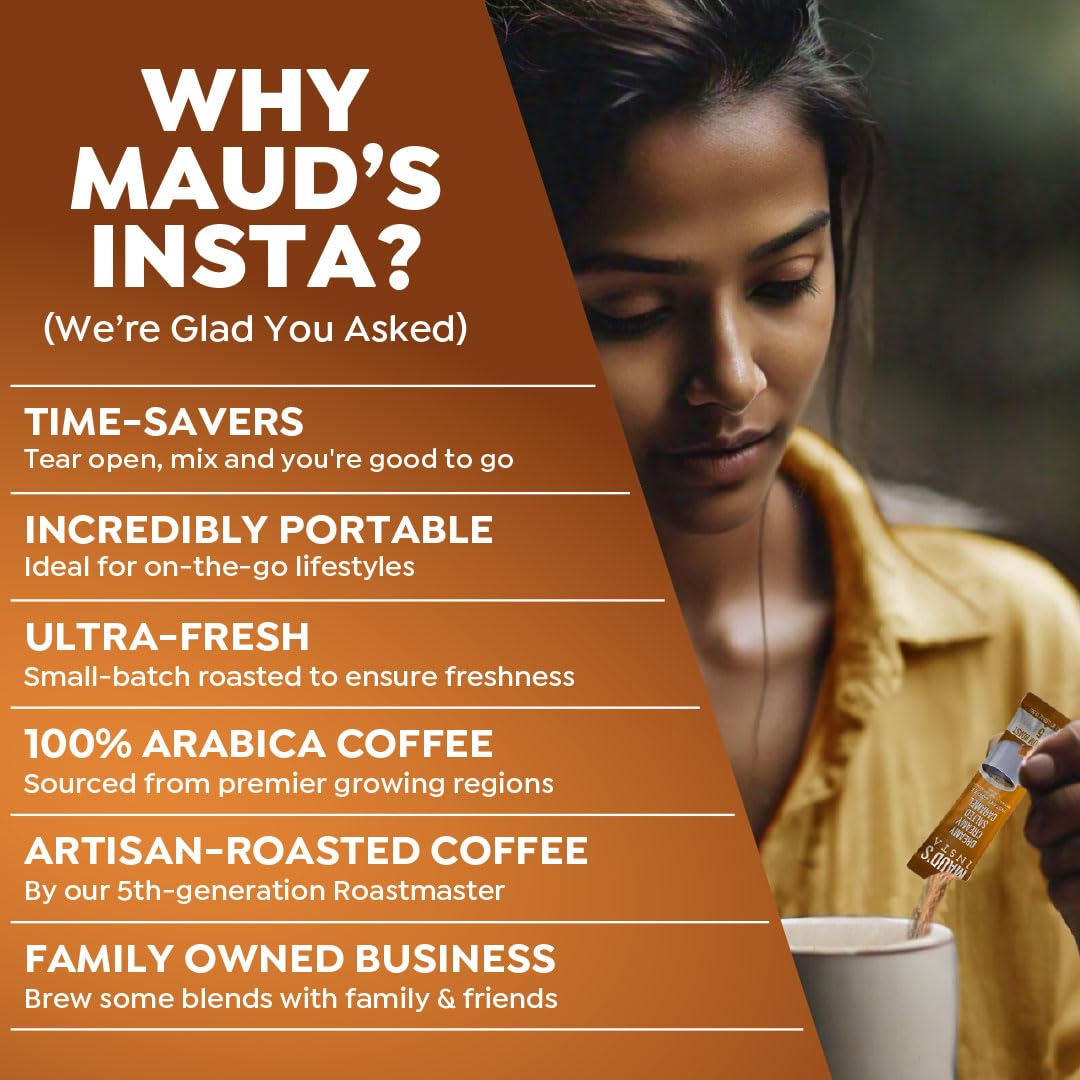 - Q: Is Maud's Instant Coffee made with high-quality ingredients? A: Yes, Maud's Instant Coffee is made from 100% Arabica coffee beans, ensuring a rich and flavorful coffee experience. The coffee is sourced from premier growing regions and includes organic and fair trade options.