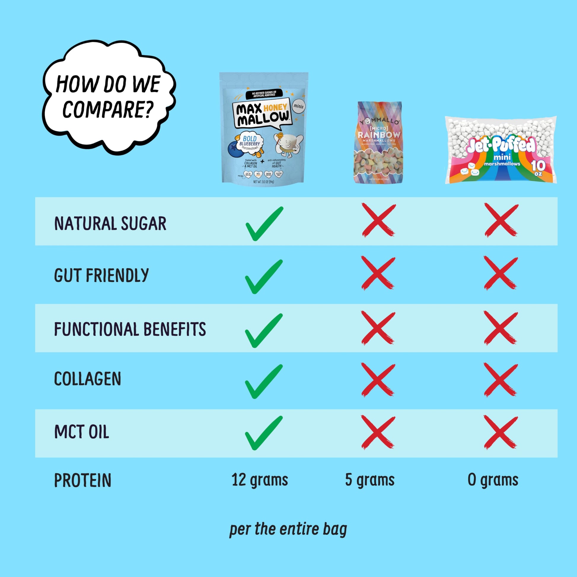 Indulge In The Smooth, Refreshing Flavor Of Honey And Blueberries With Max Mallow Bold Blueberry Mini Honey Marshmallows!. These Gut-Friendly, Gluten-Free Mini Marshmallows Combine The Bright, Enjoyable Taste Of Blueberry With The Natural Sweetness Of Wildflower Honey. Designed For Those Following A Health Focused Lifestyle, These Marshmallows Offer Zero Fat, Rich Flavor, And No Refined Sugars, Making Them A Guilt-Free Way To Enjoy An Updated Experience To A Timeless Treat. Plus, Theyre Infused With Collagen For Added Wellness Benefits. Enjoy Them Straight Out Of The Bag, Sprinkle Them Over Your Favorite Dessert, Or Melt Them Into Your Morning Coffee. No Matter How You Snack, Youll Love The Perfect Balance Of Honey, Blueberries, And Fluffy Goodness!