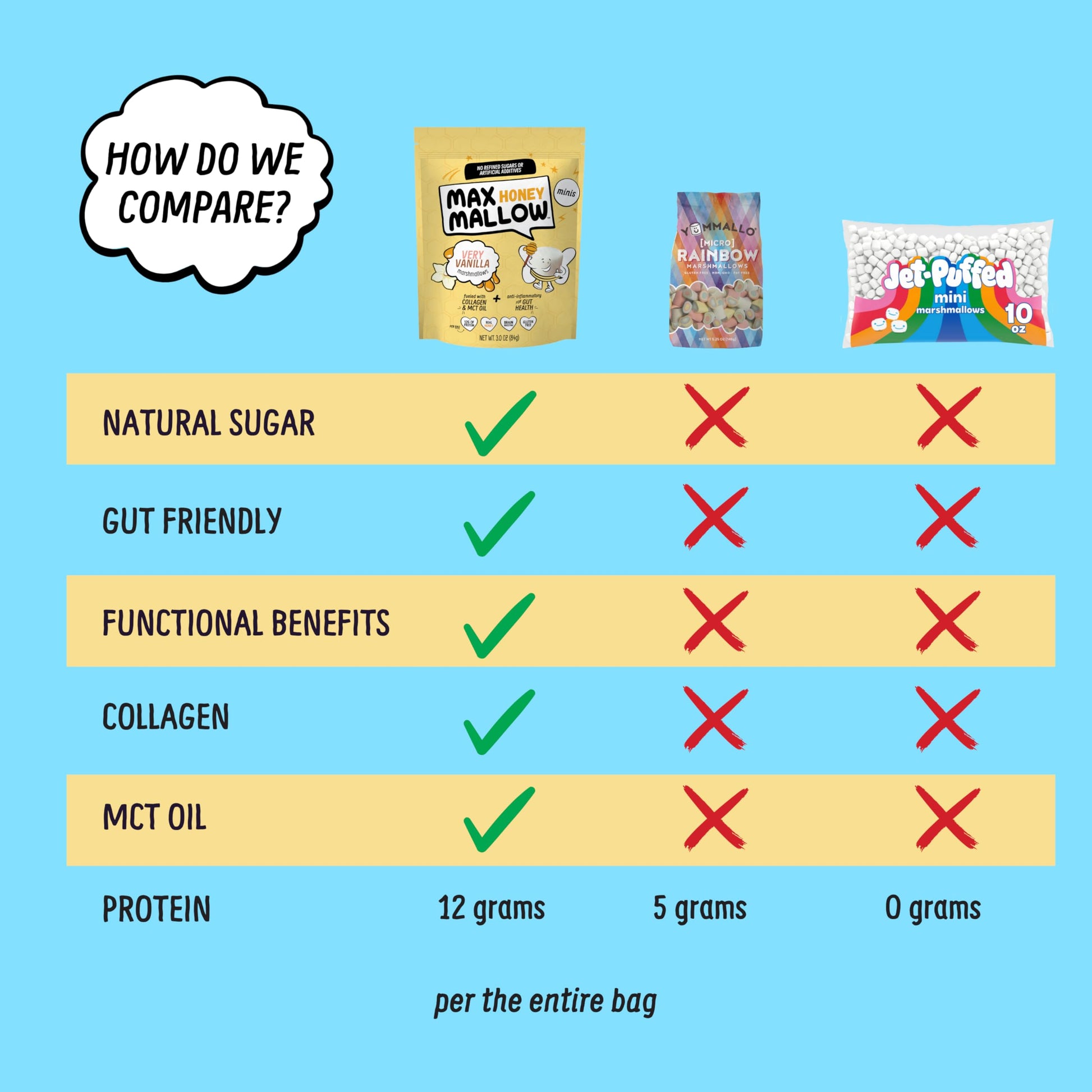 Indulge In The Smooth, Creamy Flavor Of Vanilla With Max Mallow Very Vanilla Mini Honey Marshmallows! These Gut-Friendly, Gluten-Free Mini Marshmallows Combine The Warm, Comforting Taste Of Vanilla With The Natural Sweetness Of Wildflower Honey. Designed For Those Following A Health Focused Lifestyle, These Marshmallows Offer Zero Fat, Rich Flavor, And No Refined Sugars, Making Them A Guilt-Free Way To Enjoy An Updated Experience To A Timeless Treat. Plus, Theyre Infused With Collagen For Added Wellness Benefits. Enjoy Them Straight Out Of The Bag, Sprinkle Them Over Your Favorite Dessert, Or Melt Them Into Your Morning Coffee. No Matter How You Snack, Youll Love The Perfect Balance Of Honey, Vanilla, And Fluffy Goodness!