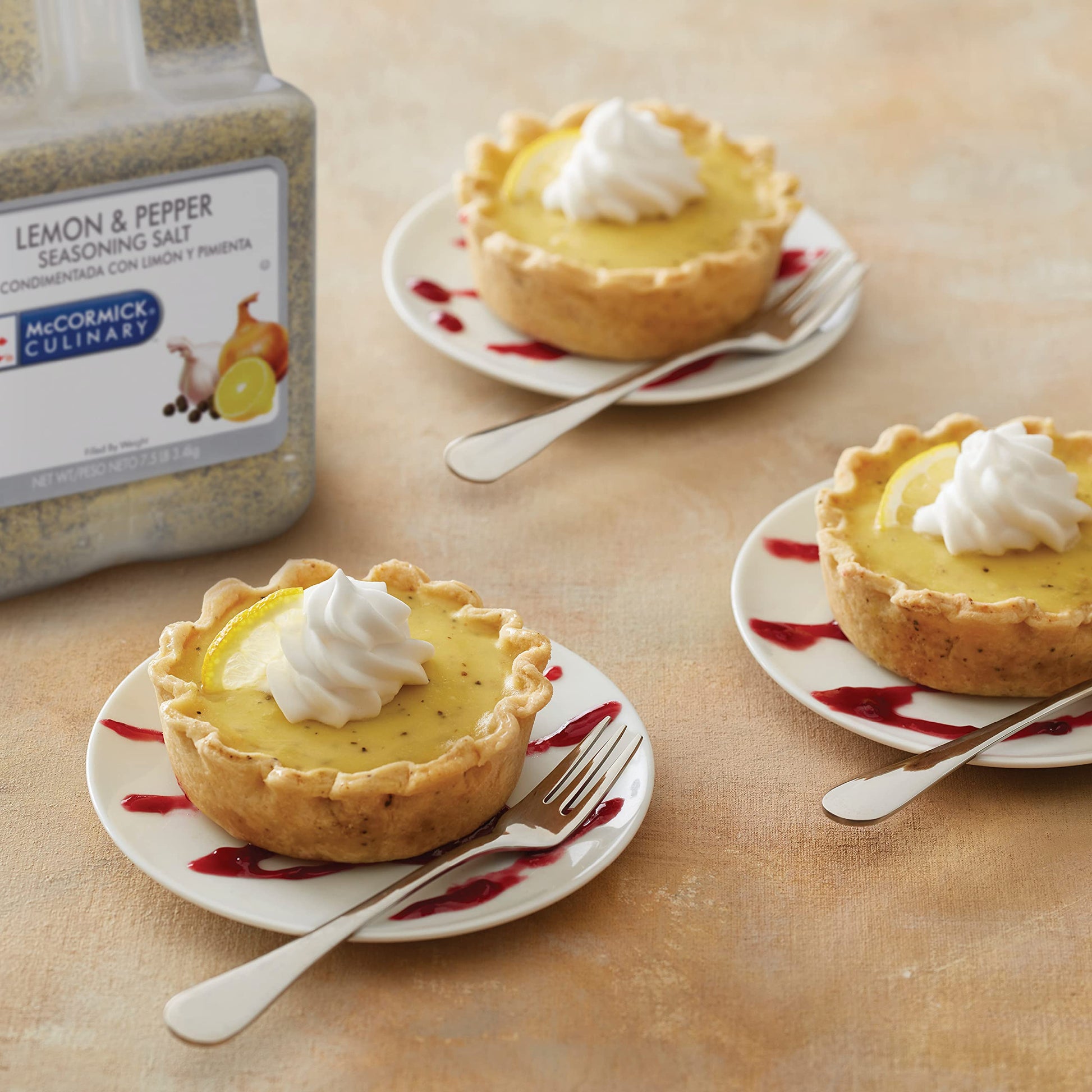 - Q: What is the size of the container for McCormick Culinary Lemon & Pepper Seasoning Salt? A: The seasoning salt comes in a seven and a half pound container, making it suitable for bulk use in restaurants and foodservice operations.