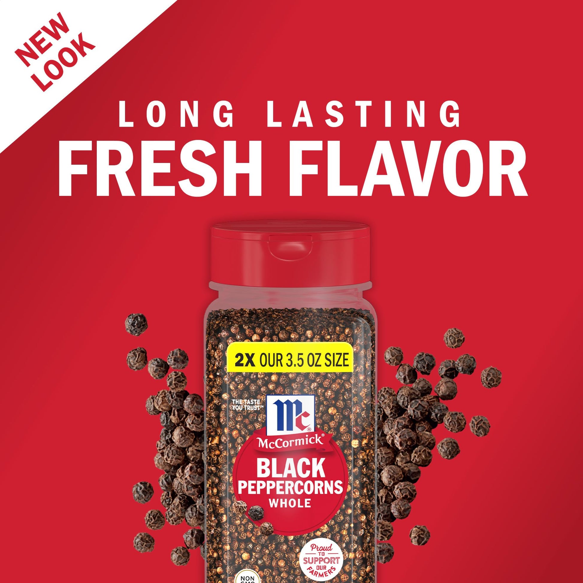 - Q: What is the size of the McCormick Whole Black Peppercorns package? A: The McCormick Whole Black Peppercorns come in a seven-ounce package, which is twice the size of the standard three and a half-ounce size, providing a generous supply.