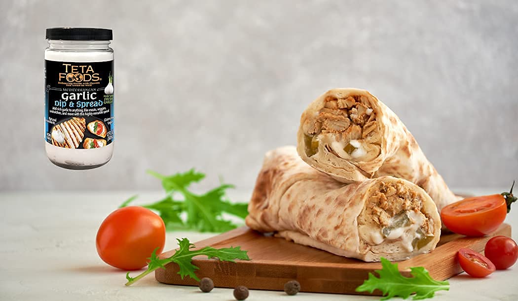 Mediterranean garlic dip and spread, vegan, great substitute to mayonnaise with garlic flavor, natural ingredients, gluten free, no cholesterol, no hydrogenated oil. Very popular spread and dip at Mediterranean, restaurants, Complimentary product to use with Teta Foods Shawarma and Shish Tawook marinades