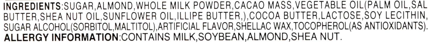 Q: What are the ingredients in Meiji Almond Chocolate?A: Meiji Almond Chocolate consists of high-quality almonds coated in rich chocolate, providing a perfect balance of crunch and sweetness.