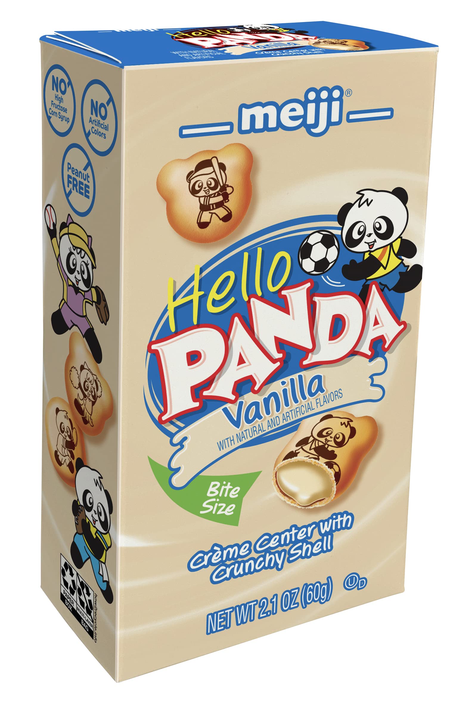 Q: What are MEIJI Hello Panda Cookies made of?A: MEIJI Hello Panda Cookies are made with a crunchy shell filled with a smooth vanilla crème center. Each cookie features fun shapes and drawings of pandas participating in various sports.