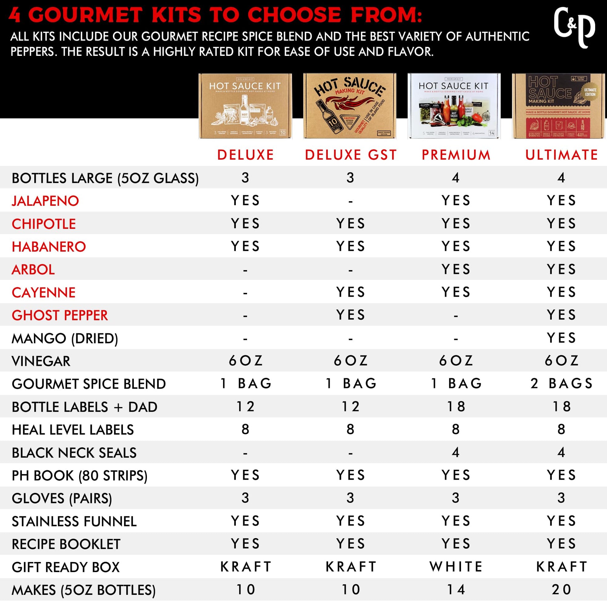 - Q: What is included in the Deluxe Hot Sauce Making Kit? A: The Deluxe Hot Sauce Making Kit includes three glass bottles with caps, 11 fun labels for customization, a stainless steel funnel, 100 pH test strips, gloves, three bags of dried chili peppers (Jalapeno, Chipotle, and Habanero), a gourmet spice blend, apple cider vinegar, a complete recipes and instructions booklet, all presented in a premium gift box.