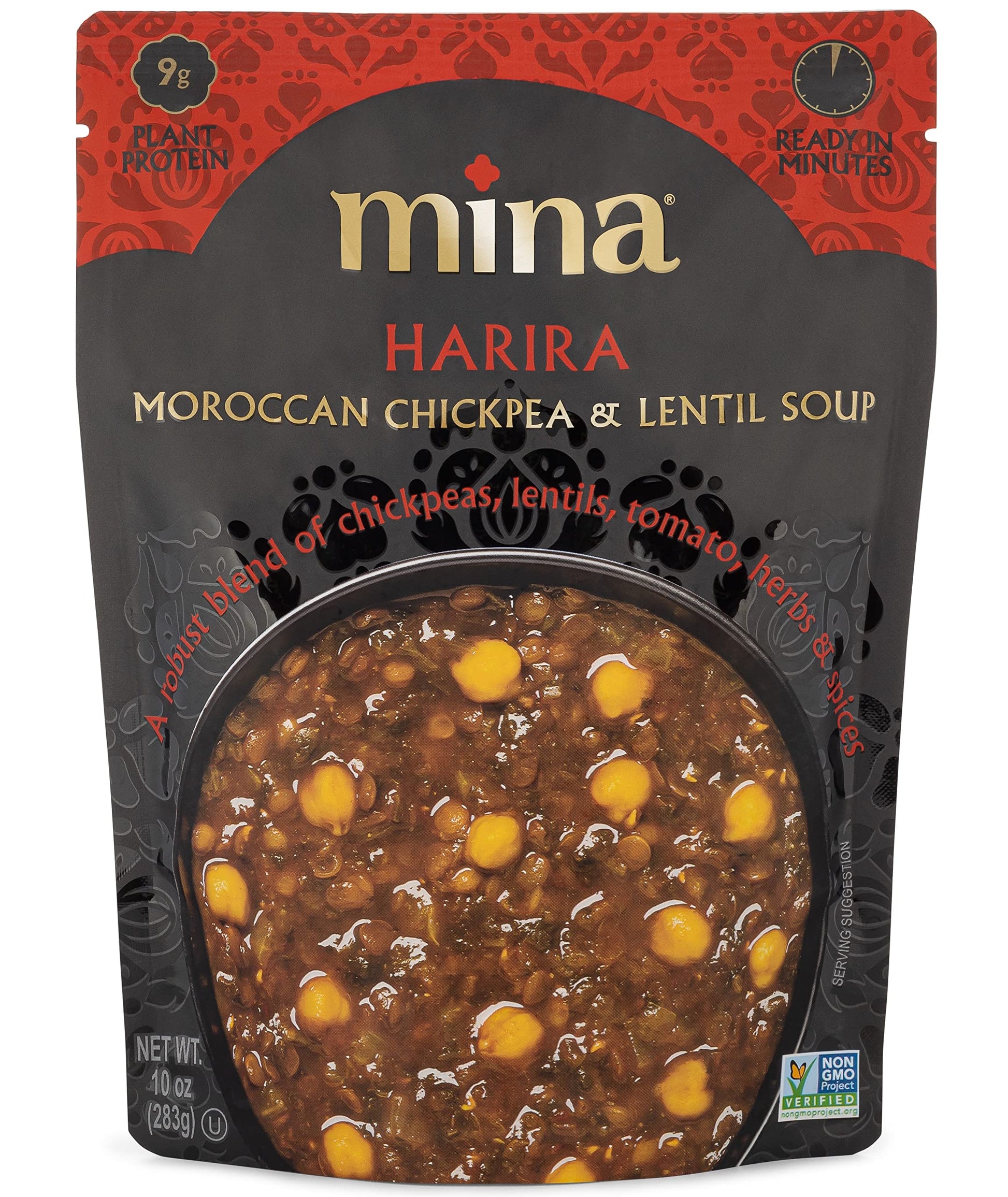 ADVENTURE: Embark on a culinary journey with Mina slow simmered Harira soup, a cherished family recipe that brings the authentic flavors of Morocco to your table. Perfectly crafted for your fast-paced life, just heat, love, and enjoy the taste of tradition in every bite! | HEAT & EAT: No hassle, no fuss. Our Harira soup is fully cooked and ready to enjoy. Simply warm in the microwave for 1-2 minutes or heat on the stove-top until piping hot. Convenient and delicious, it’s ready whenever you are! | GREAT TASTE: Delight in the rich, robust flavors packed into every spoonful. Our Harira soup is made with premium chickpeas, lentils, and traditional Moroccan seasonings, offering a taste that's both exotic and comforting. It's a satisfying meal that surprises with every bite. | CONVENIENT: Our Moroccan Lentil soup is the perfect solution for busy days. Ready to eat straight from the package, it pairs wonderfully with rice, couscous, or your favorite bread. Whether you're looking for a quick vegan and vegetarian snack, a hearty side dish, or an easy on-the-go meal, Mina has you covered. | WHOLESOME: Nourish your body with our 100% plant-based protein soup. Made from chickpeas and lentils, it’s Non-GMO Project Verified, Kosher, and Gluten-Free. Plus, with no added sugar and BPA-free packaging, you can enjoy a wholesome, nutritious meal that’s good for you and the planet.