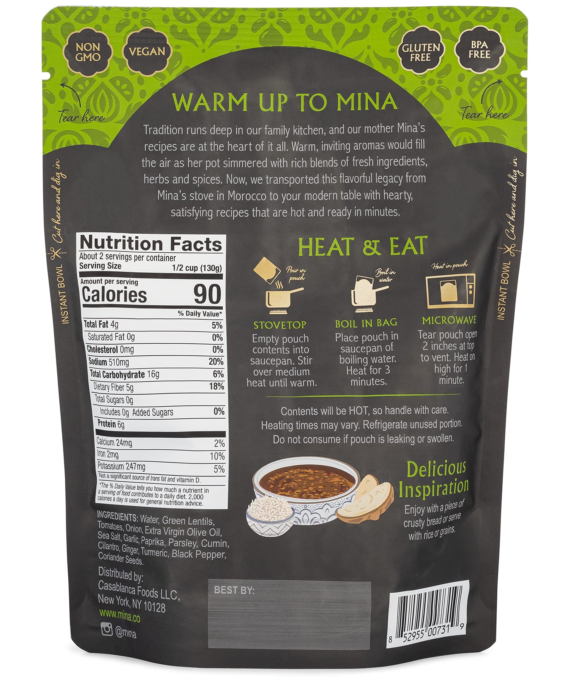 PROTEIN-PACKED: Enjoy a hearty and healthy food option with Mina Moroccan Lentils, delivering 100% plant-based vegan protein in every bite. Perfect for quick meals that are both nutritious and satisfying. | GLUTEN FREE & VEGAN: Our ready to eat meals are not only convenient but also cater to your dietary needs. These lentils are gluten free, vegan, and Non-GMO, ensuring a wholesome and guilt-free indulgence | INSTANT FLAVOR: Savor the rich taste of traditional Moroccan seasonings in every spoonful of our lentil soup. These microwave meals are crafted with premium ingredients for an instant food experience that delights your taste buds. | CONVENIENT & READY TO EAT: Mina lentils are perfect for your fast-moving lifestyle. These meals ready to eat are microwavable and require no additional cooking-just heat and enjoy as a side dish or a main course. | VERSATILE MEAL OPTION: Pair our lentils ready to eat with rice, bread, or enjoy them on their own. Ideal for vegan and vegetarian diets, these lentils offer a quick, healthy, and delicious meal solution.
