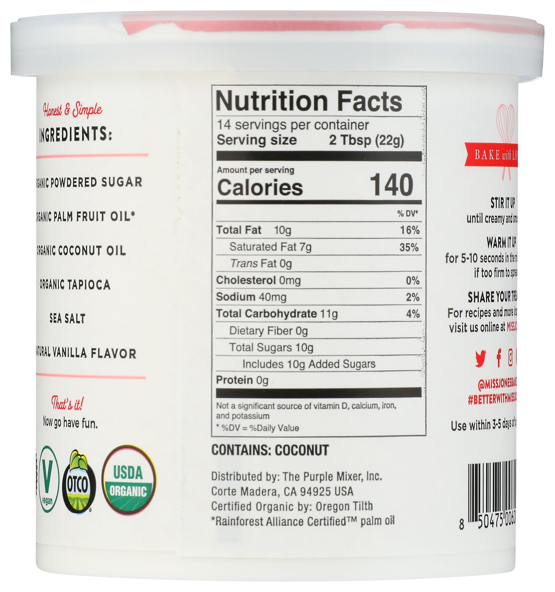 Q: What are the key ingredients in this frosting?A: This frosting is made from organic, non-GMO ingredients, ensuring a high-quality product without hydrogenated oils, trans fats, or artificial colors and flavors.