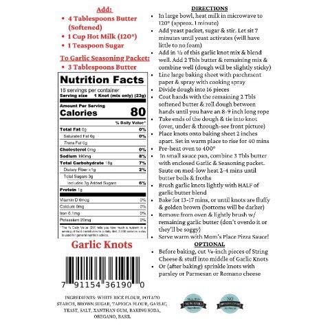 Q: Are Mom's Place Gluten Free Garlic Knots Mix suitable for those with dietary restrictions?A: Yes, this mix is gluten-free, non-GMO, and dairy-free, making it a great option for those with specific dietary needs.