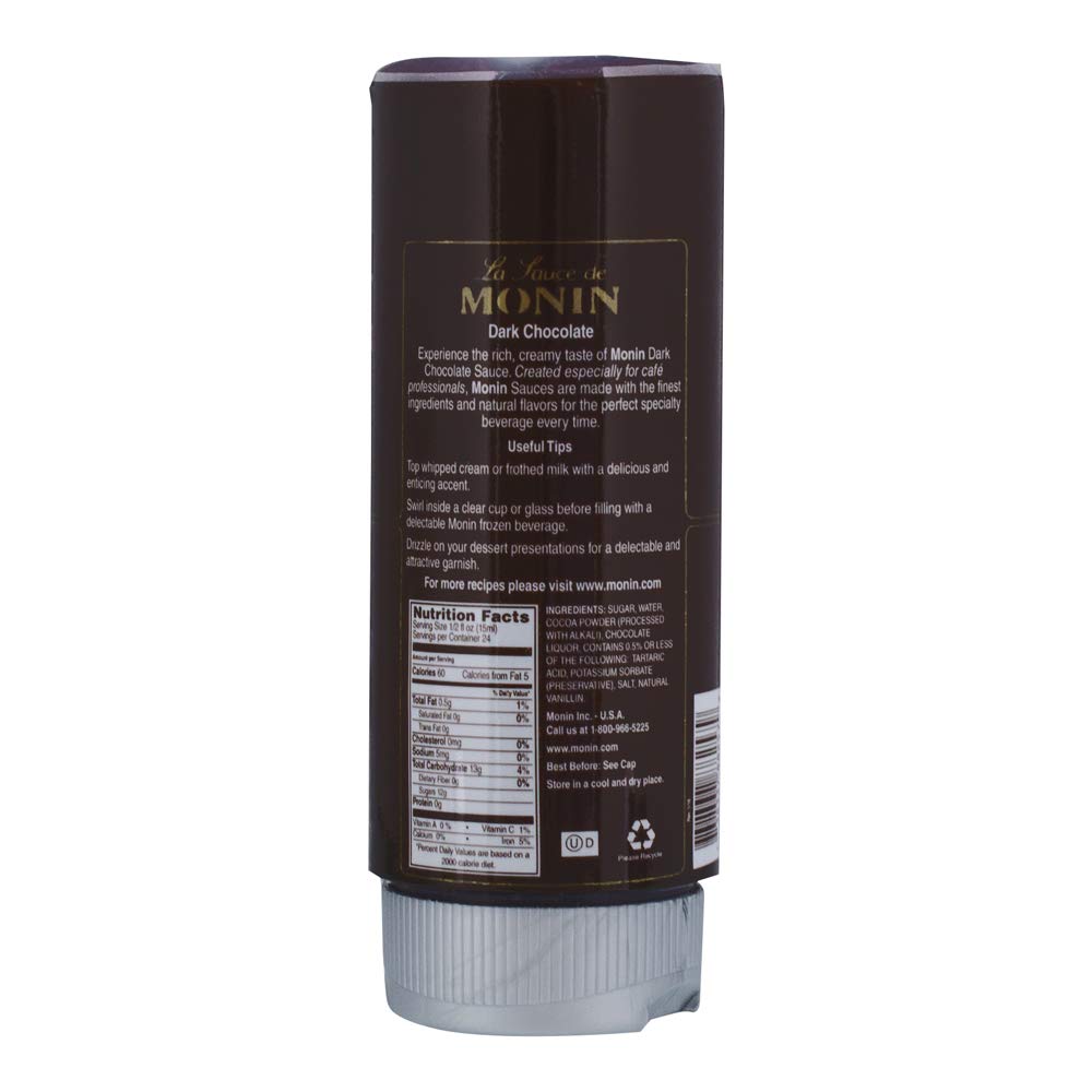 Q: What makes Monin Dark Chocolate Sauce different from other chocolate sauces?A: Monin Dark Chocolate Sauce stands out due to its rich dark chocolate aroma and flavor that is creamy yet not overly sweet. Additionally, it is made with high-quality ingredients and supports environmentally friendly initiatives.