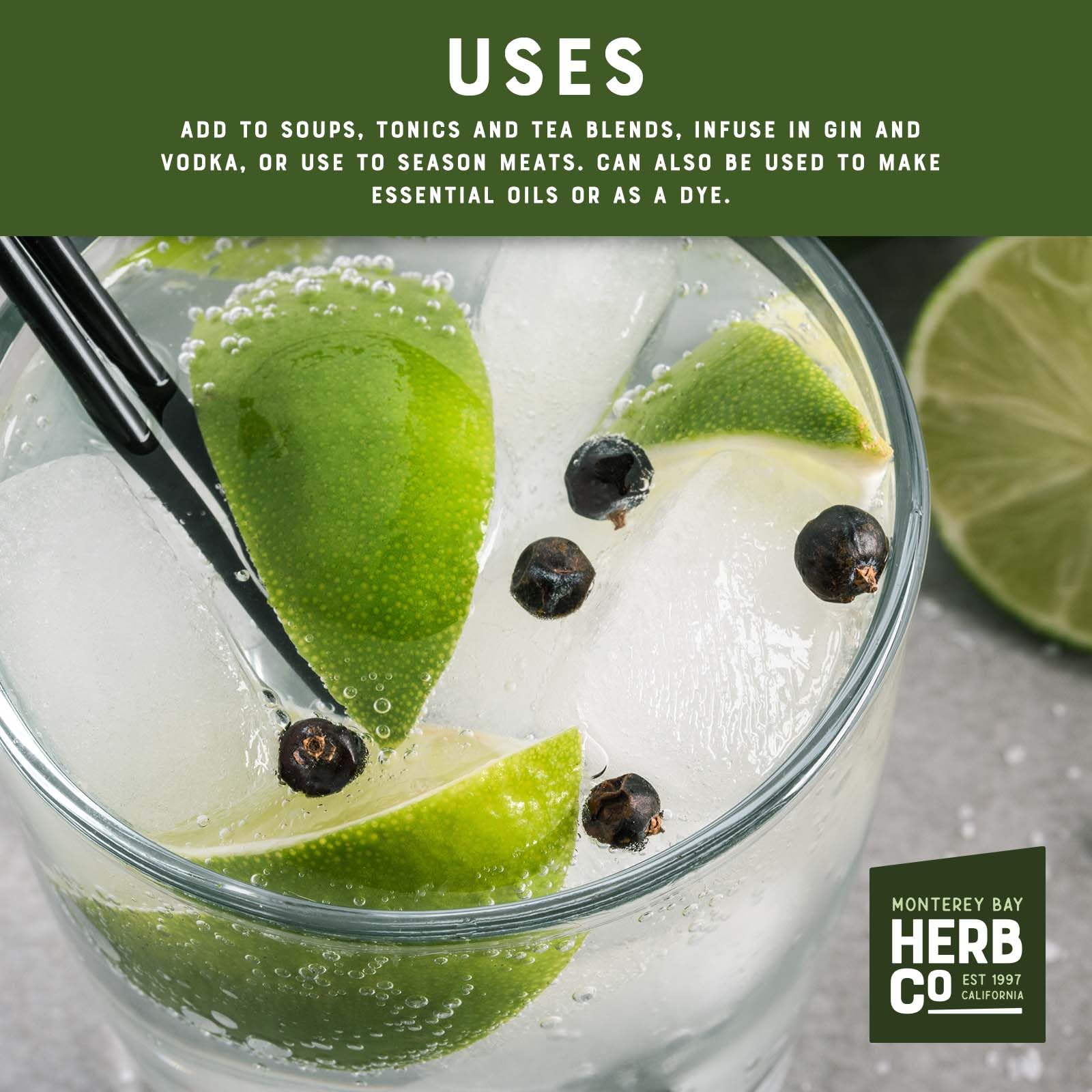 USES: Perfect addition to soups, braised meats and game. The whole berries are also traditionally added to sauerkraut. It can also be infused with alcohol to create skin and hair products. | APPEARANCE: Whole, dark blue berries with a pine-like aroma when crushed. It has a strong, resinous, and pine-like flavor. | STORAGE: Keep in a well-sealed container away from drafts and excessive moisture and light.