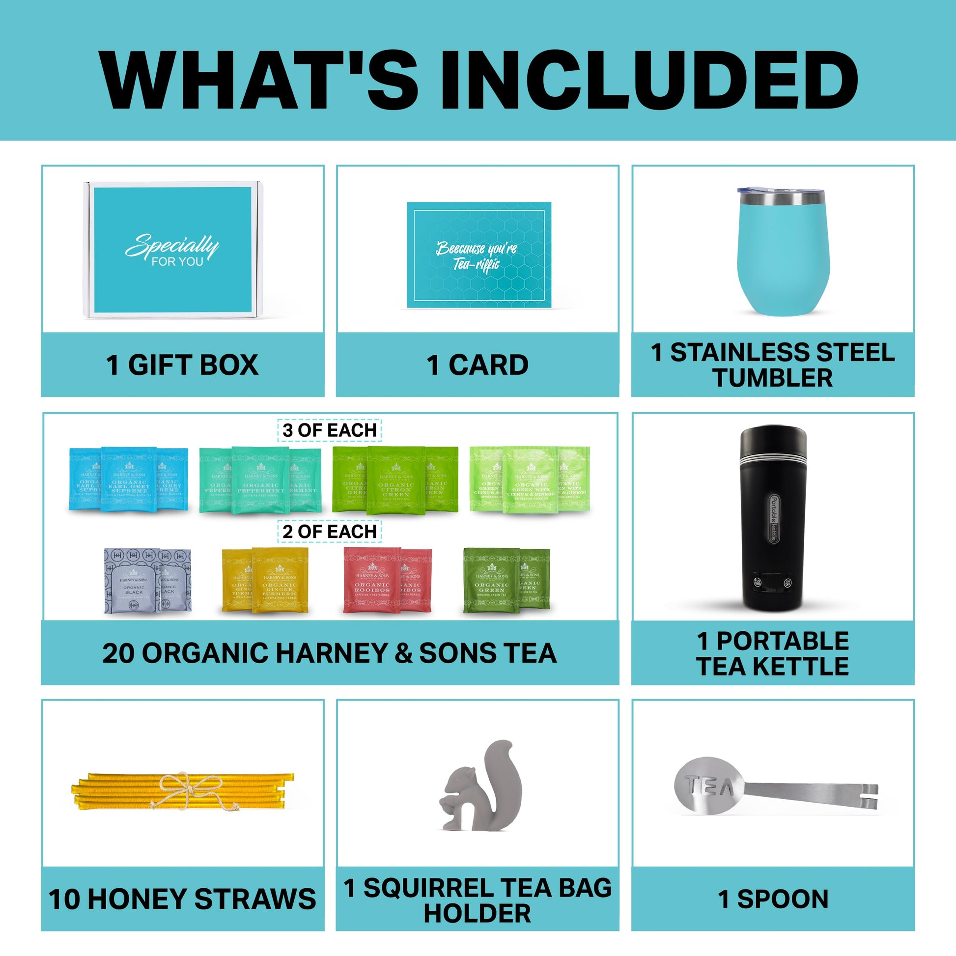 Q: What accessories are included in this tea gift set?A: The tea gift set comes with essential accessories including 10 pure honey straws, a stainless steel tea-spoon squeezer for mess-free steeping, and a whimsical silicone squirrel tea bag holder.