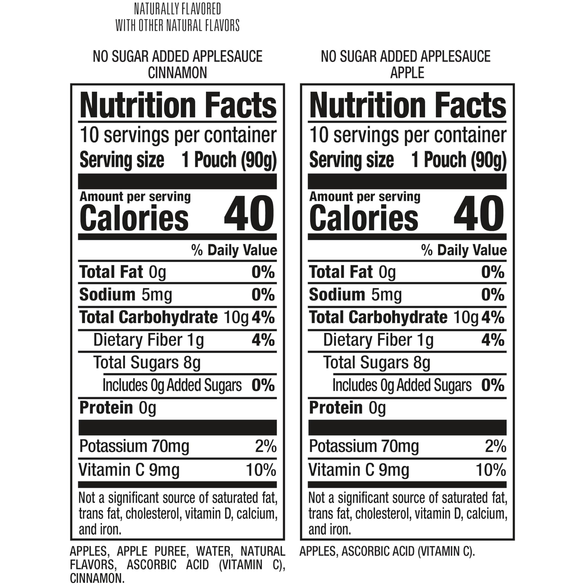 Q: How many pouches are included in the variety pack?A: The Mott's No Sugar Added Applesauce Variety Pack includes a total of 20 pouches, consisting of 10 Cinnamon and 10 Original flavors.