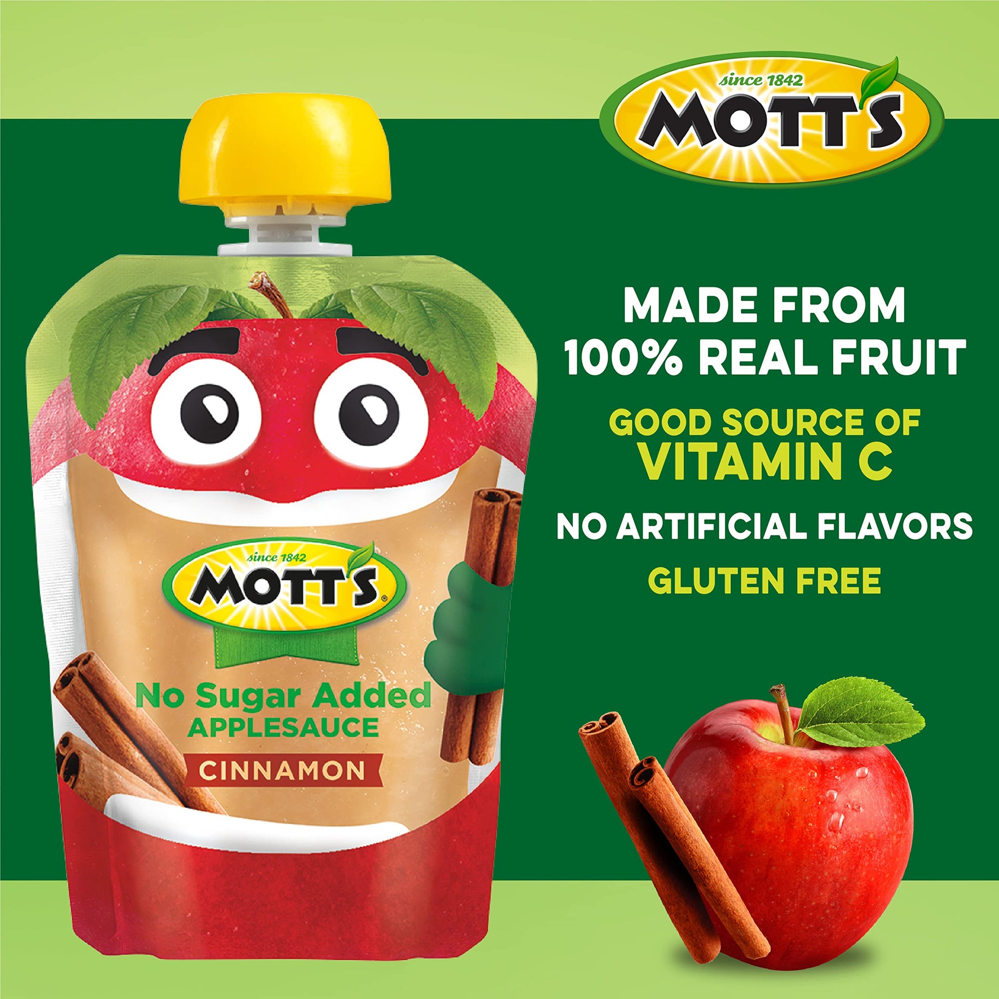 The Original, Delicious Treat, Mott'S No Sugar Added Cinnamon Applesauce Pouches Are The Perfect Snack Or Meal Companion. It'S A Good Source Of Vitamin C And Free Of Cholesterol. Bringing The Best Of The Orchard To Your Household, Mott'S Helps Families Enjoy Delicious Fruit Goodness Every Day. The Apple Juice And Sauce Brand Is Dedicated To Giving Moms Easy Ways To Help Their Families Be Their Very Best. Mott'S Has A Strong Heritage And Has Been The Trusted Apple Juice And Sauce Brand Since 1842. Mott'S Hold The Apples To A Very High Standard, That'S Why The Products Pack Lots Of Delicious Fruit Flavor From Ripe Apples Into Every Serving. Enjoy Mott'S In A Variety Of Pack Types Including Pouches, Cups, Jugs, Juice Boxes And Jars; So Whether You'Re Home With Your Family Or On-The-Go And In Need Of A Snack, Mott'S Has A Product For You. You Won'T Find Any Artificial Flavors In Mott'S Products, So You Can Feel Good About Making Healthy Choices.