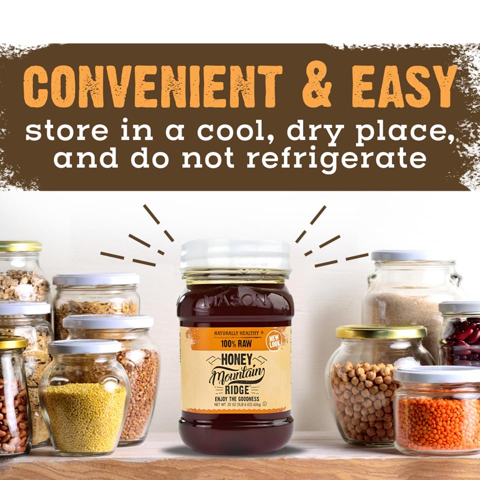 Q: What size does the Mountain Ridge Honey jar come in?A: Mountain Ridge Honey comes in a 22-ounce jar, which is convenient for storage and helps keep moisture out, preserving the honey for longer periods.