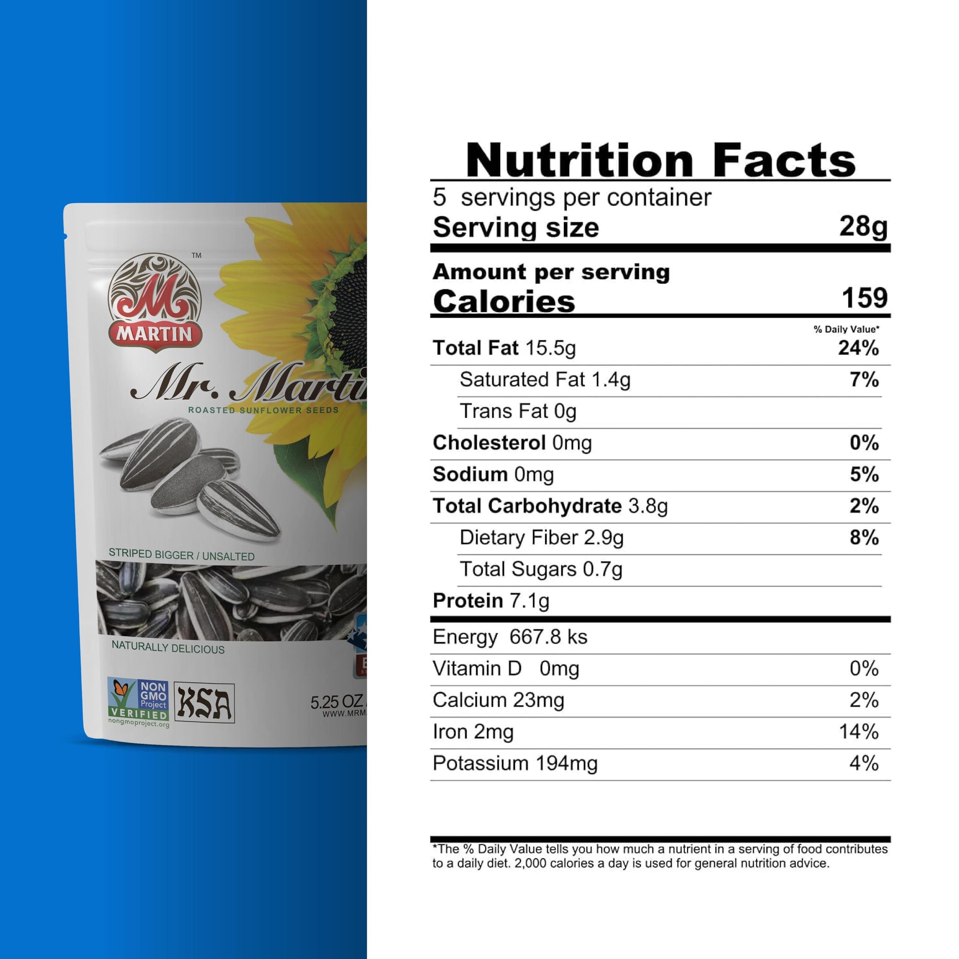 Discover the ultimate snacking pleasure with MR. MARTIN Freshly Roasted Unsalted Sunflower Seeds. Our selection ensures only the finest and crunchiest sunflower seeds make it into each pack, providing a unique, savory delight with their natural flavor-entirely guilt-free! Designed for the health-conscious, these unsalted sunflower seeds to eat are perfect for maintaining your diet without compromising on taste. Free from artificial additives or preservatives, theyre a snack you can rely on for nutrition and quality. What sets MR. MARTIN apart is our unwavering commitment to excellence and sustainability. Our non-GMO seeds are vegan and kosher-certified, upholding the highest standards of purity and dietary needs. We source our seeds from farms that practice sustainable and eco-friendly methods, so you can snack with confidence and support the planet. Each 5.25 oz pack features a resealable design to maintain freshness, ensuring every handful is as crisp and flavorful as the first. The 3-pack bundle makes it convenient to enjoy these tasty unsalted roasted sunflower seeds anywhere-whether at work, on the go, or relaxing at home. Theyre also ideal for outdoor adventures, gym sessions, or adding a nutritious crunch to your favorite salads and recipes.Packed with plant-based protein, healthy fats, and essential nutrients, MR. MARTINs roasted unsalted sunflower seeds offer more than just a snack-they provide a nourishing boost to fuel your active lifestyle. Whether following a specific diet or simply seeking a healthy snacking alternative, these seeds present the perfect balance of taste, nutrition, and convenience.
