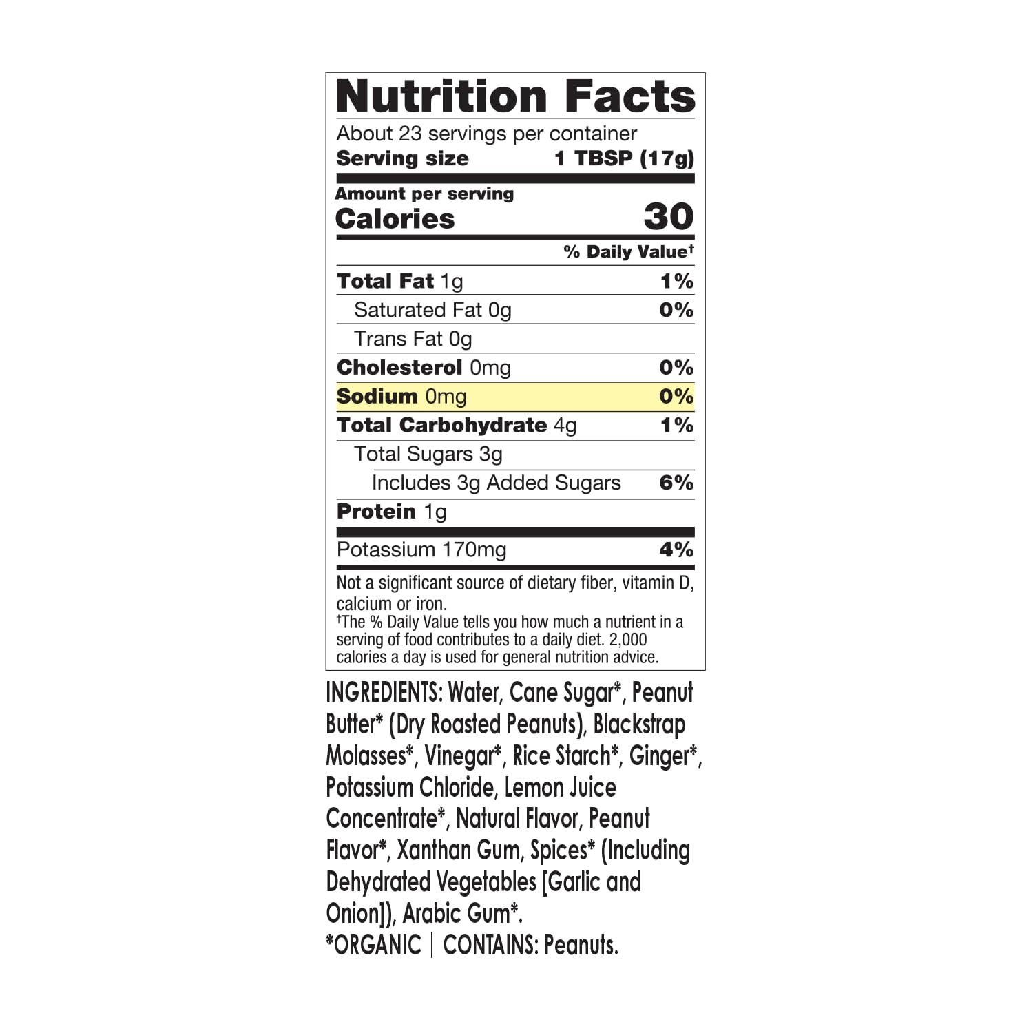 Q: What are the main ingredients in Mr. Spice Organic Thai Peanut Sauce?A: The main ingredients include water, sugar, grain vinegar, peanut butter, blackstrap molasses, rice starch, potassium chloride, ginger puree, and various organic herbs and spices.